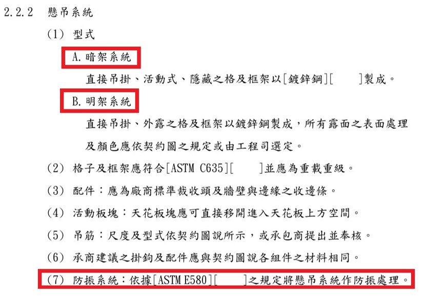 建築物除了結構體必須耐震設計外,非結構性之設備如電力系統、供水系統、冷卻系統、空調系統、消防設備等也必須具備必要之耐震或防震設置,暗架天花也不能例外。雖然目前天花板之耐震規範只適用明架系統,但是工程會所頒佈之施工綱要規範第095815章 輕型鋼架天花板 第2.2.2節懸吊系統,則明確規定無論是明架系統或暗架系統均必須依照ASTM E580之規定作防震處理,詳圖2。換言之,施作暗架系統之天花板,如果缺乏明確之耐震設計方法時,ASTM E580之懸吊系統規定仍必須參考選用,以符合耐震安全。
