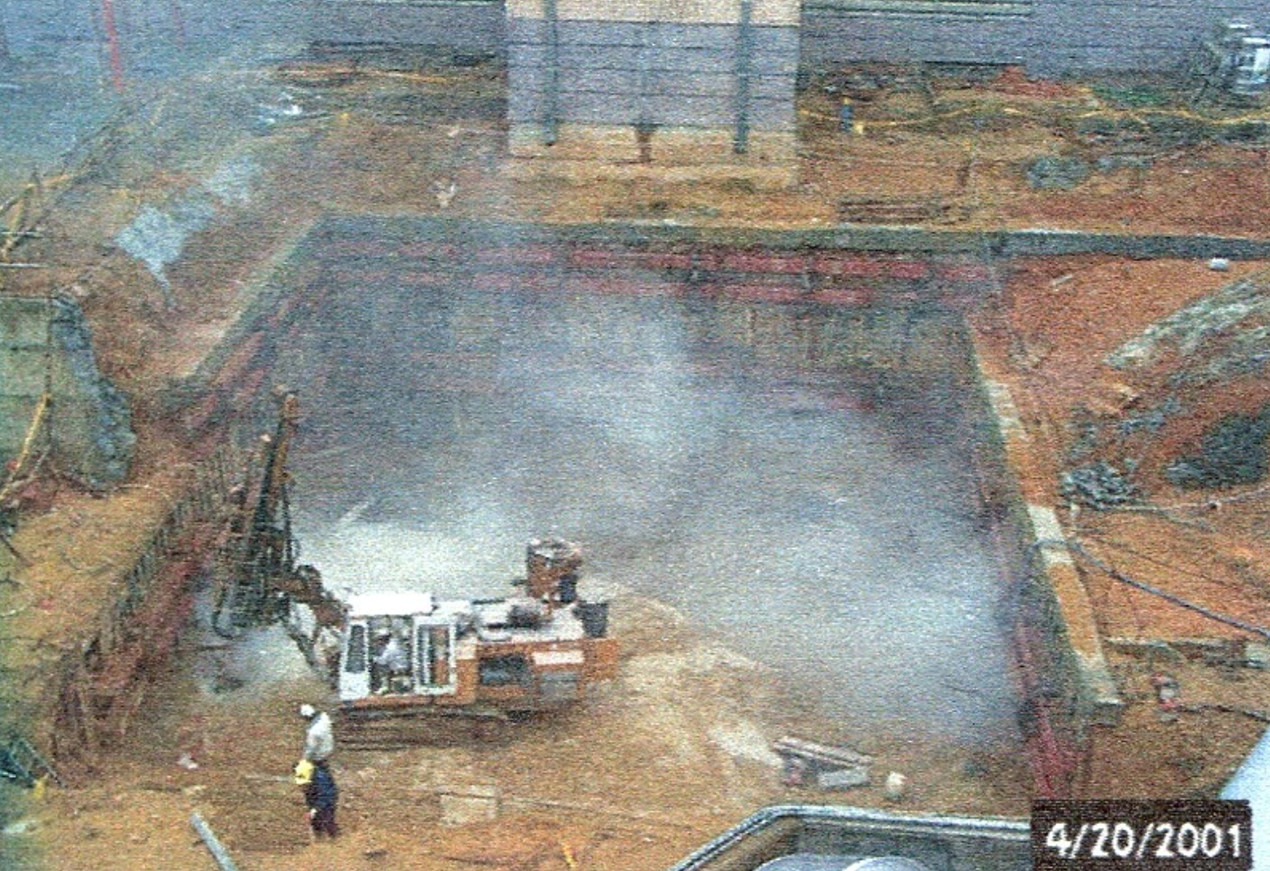 塔山電廠基地底大部分為堅硬的花崗岩所組成,依據鑽探報告岩石的單壓試驗強度在340~1,748kgf/cm2間。施作擴建部分機組結構為顧及一至四號機組的既有設備及廠房之安全,施工的開挖工作相當不易,尤其是煙囪基礎開挖的岩盤只有中央部分符合設計高程,其他周邊皆提早碰到岩盤。經和設計單位溝通協調後,變更設計將岩盤的開挖高程提高,其超過的岩盤高程,難以挖土機振動掘除。衹好將岩盤鑽孔填少量炸藥以榻榻米遮蓋,以厚鐵板壓住榻榻米後,爆破成碎片以挖土機掘除土石,如此重復三次才挖掘到變更後的設計高程,工作相當緩慢及危險(詳圖3)。