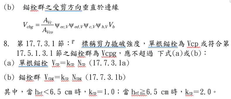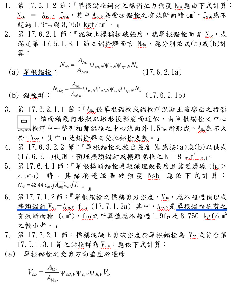 三、現行設計規範錨栓混凝土檢核要項 現行《建築物混凝土結構設計規範》第17章(混凝土結構用錨栓)所提供之錨栓設計要求,係探討結構用錨栓埋設於純混凝土中之結構力學行為,針對預埋式基礎錨定螺栓所需檢核要項列舉如下。 四、預埋式基礎錨定螺栓之簡易錨定設計法 現行《建築物混凝土結構設計規範規範》第17章(混凝土結構用錨栓)所提供之錨栓設計要求,係探討結構用錨栓埋設於純混凝土中之錨定設計,惟現行設計規範對預埋式結構用基礎錨定螺栓所需檢核項目甚多且複雜,不但公式煩複又不常用,難以熟悉運用,又因係以純混凝土承受錨栓力量,對預埋式單根基礎錨定螺栓或錨栓群,混凝土強度所能提供的拔出、拉破、剪破等所能提供之可用強度甚低,工程師經常花費很多時間去檢核但計算結果却無法滿足使用需求及耐震需求而坐困愁城。因此建議採用一般鋼筋混凝土結構設計規範的規定及設計方法,不但簡單容易且安全性明確可靠。設計步驟及方法建議如下。 1.決定所需錨栓尺寸及材質:若為固定桶、槽或機械設備所需之錨栓直徑及長度,通常係由桶、槽或機械設備的供應商提供。鋼結構之柱基座及其他情況須由結構設計單位決定錨栓尺寸及材質,於設計初期須對錨栓的可埋置空間(含深度)、邊距、間距及混凝土強度等進行整體評估規劃,並依照結構受力情況(如拉力、剪力或組合受力)選定錨栓材質規格及錨栓尺寸。若結構設計較為複雜或受力較大,亦可考慮使用高強度錨栓或特殊錨栓錨定系統,以配合基礎可用尺寸。錨栓長度以盡可能埋置於柱墩高度範圍内,避免需延伸進入基礎版內而影響施工便利性,惟不得己情況下基礎錨栓仍可進入基礎版内。 2.錨栓之拉力強度依設計規範第17.6.1.2節規定:『單根錨栓鋼材之標稱拉力強度Nsa應由下式計算: Nsa= Ase,N futa,其中Ase,N為受拉錨栓之有效拉力斷面積cm2,futa應不超過1.9fya與8,750 kgf/cm2之較小值。』對於螺桿與擴頭式螺栓,ANSI/ASME B1.1 (2003) 定義Ase,N為Ase,N=π/4〔da-0.9743/nt〕2,其中 nt 是每公分之螺牙數目。上式計算結果可簡化以0.75取代。選擇適合的錨栓尺寸與材質時,應依據承載需求,優先考慮規範所建議之規格與材質標準,以方便採購。錨栓材質除需具備足夠的強度與韌性外,亦應考慮其耐蝕性及與混凝土間之相容性,避免因環境因素導致腐蝕或劣化,影響結構安全性與耐久性。 3.埋置於混凝土中之拔出強度:依據設計規範第17.6.3.2.2節:『單根錨栓之拔出強度Np應按(a)或(b)以供式(17.6.3.1),亦即Npn=Ψc,p Np,其中建議Ψc,p=1(經分析顯示在使用載重等級下,設置錨栓之混凝土構材區域會產生開裂 時,Ψc,p得使用 1.0;設置錨栓之混凝土構材區域未產生開裂 時,Ψc,p 得使用 1.4)。預埋擴頭錨釘或擴頭螺栓之Np=8 Abrg f’c』。建議使用Npn=Ψc,p Np=8 Abrg f’c,其中Abrg為重型螺帽或錨板的混凝土承壓面積。錨定螺栓之螺帽使用重型六角螺帽,基礎錨定螺栓所産生之上舉力,通常係藉錨栓錨頭之錨定機制,可分為以直桿 (二端部車牙以螺帽作為錨頭)、彎鉤、錨板、螺帽加錨板或擴頭等方式錨定,或於錨定端附加機械錨定措施、或錨栓彎鉤錨定鋼筋等錨定型式。一般在直徑25mm以下之錨栓,其錨定端可採加熱鍛造製造成擴頭型式 (有如螺栓之螺頭),惟比較常用的是以直桿二端車牙,並以重型螺帽作為錨定端之錨頭及鎖固端之螺帽。以鍛造擴頭型及直桿二端車牙並以重型螺帽作為錨定端之錨頭,係依據錨栓頭部在忽略錨栓桿身摩擦及握裹強度之貢獻下,錨頭因承壓而發生混凝土壓碎極限狀態之強度,而不是將錨栓完全拔出混凝土之極限狀態的強度。局部混凝土壓碎時,會大量降低錨定部的勁度,亦是拔出破壞之起始點。在錨栓頭部區域,周邊配置緊密圍束螺箍筋,可提高擴頭錨栓之拔出強度,其拔出強度增加量可經由試驗求得。L型彎鉤錨定方式之錨栓彎鉤處,局部混凝土壓碎時,會大量降低承壓部的勁度及強度,不建議採用。以鍛造擴頭或直桿二端車牙並以重型螺帽作為錨定端錨頭之錨栓,其錨定效果較佳。重型六角螺帽之寛度,較一般六角螺帽之寛度大約5mm,可以得到較大的混凝土淨承壓面積,「美國機械工程師學會」(ASME/ANSI B18.2.2-2010 Nuts For General Applications: Machine Screw Nuts, Hex, Square, Hex Flange, and Coupling Nuts),列出各型一般螺帽與重型螺帽之寛度尺寸,為了讓錨栓可以發展出較大的拔出強度,建議採用重型螺帽,國内經濟部重型螺帽國家標準,可採用CNS 4236 ,「美國機械工程師學會」重型螺帽標準,可採用ASME B18.2.2-2010 Table 10 (Dimensions of Heavy Hex Nuts and Heavy Hex fam Nuts) (英制)及ASME B18.2.4.6M之規定(公制)。一般六角螺帽,可以採用CNS 3130或ASME B18.2.2-2010 Table 4( Dimensions of Hex Nuts and Hex Jam Nuts)。 4.如果螺栓頭部本身提供的拔出強度不足,也可以提供2個以上相距約3D以上的螺帽或將錨板銲接在螺栓的擴頭端部。 5.錨栓配置的數量建議以多根小號為原則,配置多根小號錨栓可使錨栓與柱墩主鋼筋搭接時產生的錯位距離較小,進而可減小錨栓與柱墩主鋼筋間之錯位搭接長度。若錨栓之可埋置深度不足,則可採將柱墩主鋼筋改為小號多根,以降低搭接長度需求。另外,柱墩主鋼筋端部採用具180度標準彎鉤,或柱墩主鋼筋之端部採連續90度連續彎轉成為帽蓋型之2根柱墩主鋼筋成為連續〝冂〞字形,成為柱墩主鋼筋與基礎錨定螺栓之錨頭間形成二端具T(擴)頭或