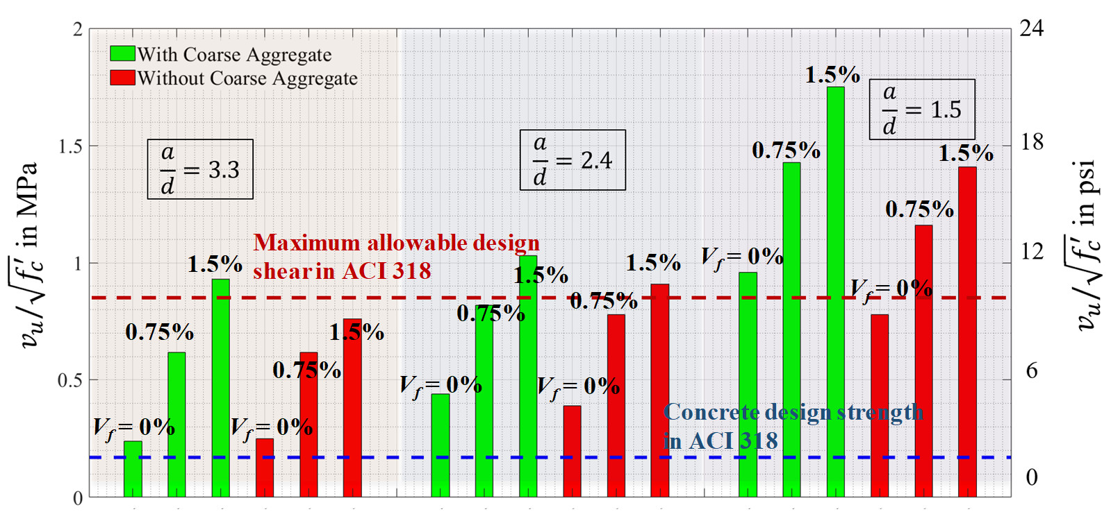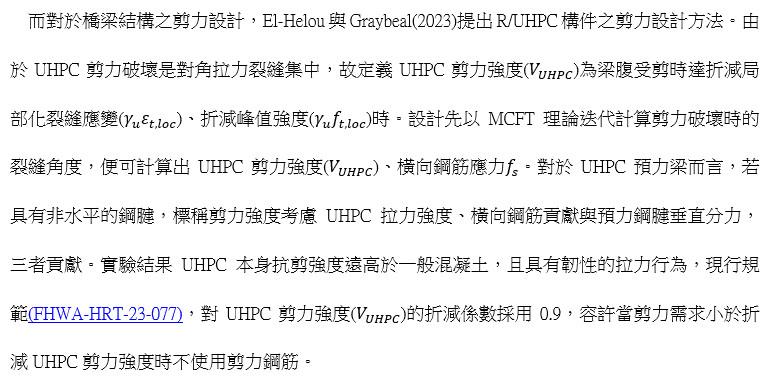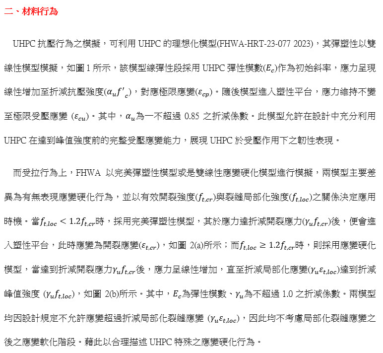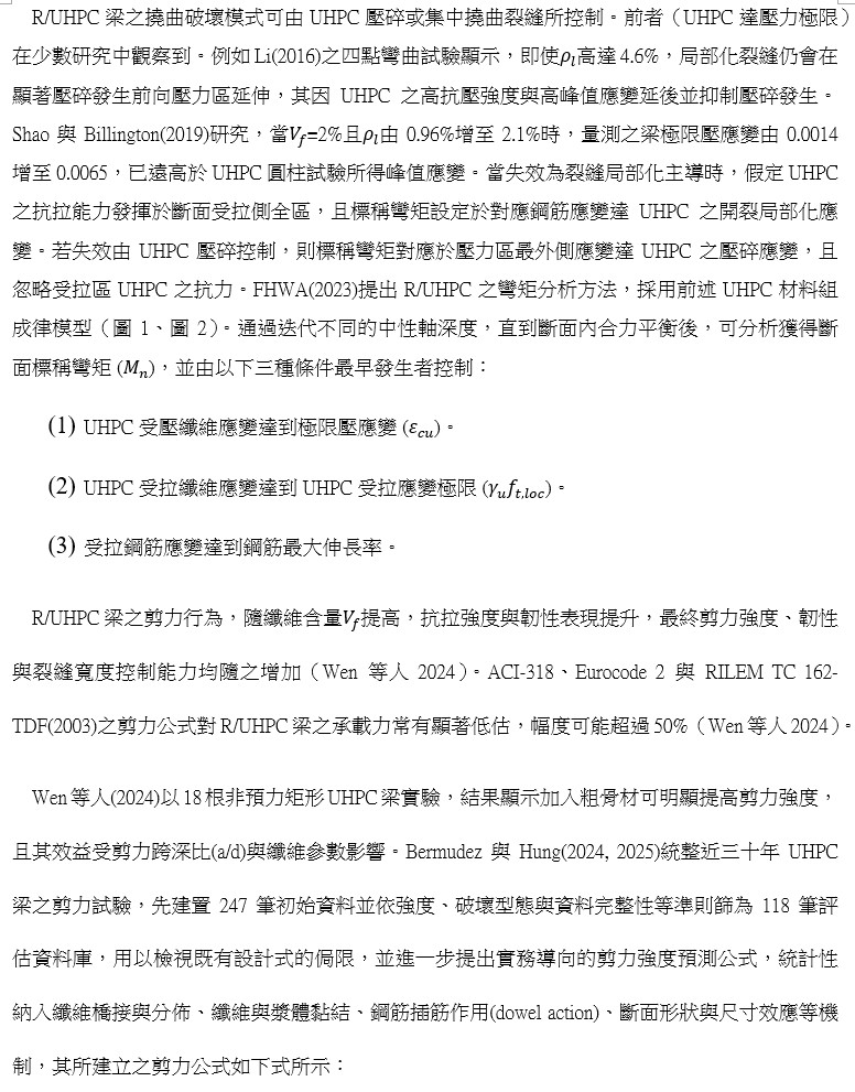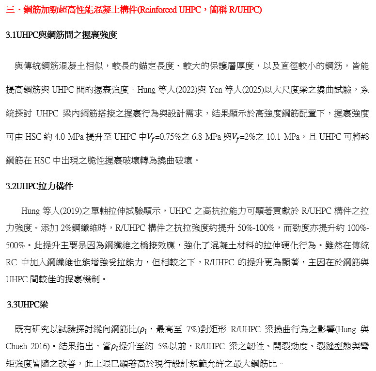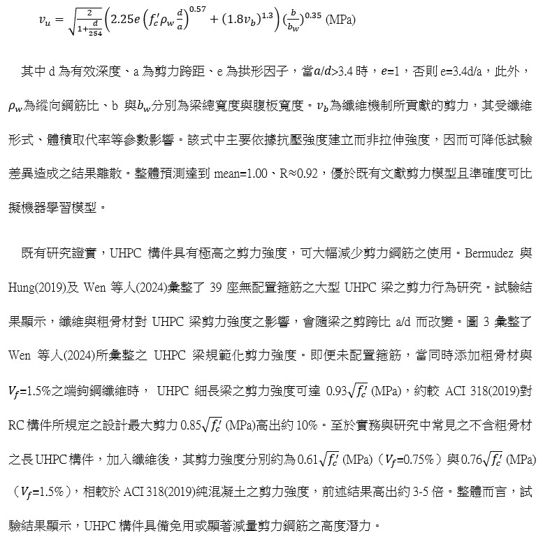 | 超高性能混凝土(Ultra-High Performance Concrete)材料特徵與結構行為 超高性能混凝土(Ultra-High Performance Concrete,簡稱UHPC)於力學性能與耐久性上具卓越表現,當應用UHPC取代傳統混凝土材料時,須全面了解UHPC構件於各類荷載作用下之結構行為。本文針對UHPC構件進行簡要性回顧,內容包含UHPC構件於軸力、剪力及彎矩作用下之行為與分析設計方法。 超高性能混凝土,又稱超高性能纖維混凝土(Ultra-High Performance Fiber-Reinforced Concrete,簡稱UHPFRC),為一新興結構材料。由於其低水膠比(w/b < 0.25)、高膠結材料含量、細微礦物摻料,以及顆粒最佳級配設計,UHPC具備極高耐久性與超高抗壓強度。UHPC之特徵為展現擬似抗拉塑性或應變硬化行為,且伴隨密集且細小的裂縫,即所謂「多重裂縫反應」(multiple cracking response)。除了改善抗拉行為外,UHPC中所添加之不連續短纖維亦能提供如同傳統箍筋般的圍束效應,使UHPC受載時,韌性、強度保持性、抗爆裂與剝落性及能量吸收能力方面,均遠優於傳統高強度混凝土(HSC)。 目前研究與工程實務已廣泛應用UHPC在新建結構、補強與修復,以及基礎設施。例如,應用於橋梁系統,包含橋面板、現澆連接、橋柱及輕質耐久之橋梁主梁。此外,由於UHPC低滲透性,其對於環境劣化作用之防護極為有效,可減少維護需求並延長使用年限。UHPC亦能使設計者發展創新之結構形式,在減少鋼筋用量、降低鋼筋擁擠與縮小斷面情況下,仍提供卓越的力學性能。 在結構應用上,UHPC構件通常配置鋼筋(R/UHPC)以提升力學行為。R/UHPC構件整體結構性能優於傳統RC構件,然其力學行為與破壞模式卻顯著不同,設計應用時需進一步了解才能有效發揮其特性。本文系統性檢視R/UHPC構件之結構行為、設計與分析方法,以促進R/UHPC之合理應用與設計,並為未來實務應用提供參考。 3.4UHPC柱設計規範通常要求特殊抗彎矩構架之RC柱配置密集之橫向鋼筋,以確保在極端荷載下呈現韌性破壞模式。然而,此要求常導致鋼筋擁擠與施工困難。基於UHPC卓越之力學與抗損傷特性,於結構柱中採用UHPC,有望在維持或改善柱之目標行為的同時,簡化鋼筋設計。 既有研究(Hung等人2018; Hung與Yen 2021)顯示,以UHPC取代傳統混凝土用於短柱與細長柱,可在不犧牲柱體抗壓行為的條件下,減少所需之圍束鋼筋量。當纖維體積取代率僅0.75%時,鋼纖維已能有效緩解混凝土剝落與壓碎,並抑制縱向鋼筋之挫屈;破壞模式之改善,平均使柱之峰值軸壓強度提升約50%。 類比於RC柱抗壓強度之評估流程,亦有研究針對R/UHPC柱提出等效壓力塊係數。Hung與Yen(2021)所得之等效係數顯著低於0.85,並評估ACI ITG-4.3R (2007)抗壓強度公式用於R/UHPC柱之適切性,結果顯示,以該文獻中公式評估R/UHPC柱之峰值抗壓強度之結果偏保守,強度平均將低估約10%。最終假定有效圍束UHPC核心面積與鋼纖維及橫向鋼筋量相關,並建立受圍束UHPC抗壓強度之預測模型,對26支UHPC柱之估算平均誤差約1%。 以UHPC取代RC柱可大幅縮小柱之斷面尺寸,但細長效應將加劇P-Delta效應,致使細長R/UHPC柱承載力下降。Hung等人(2018)對兩端鉸支、偏心受壓至破壞之細長R/UHPC柱進行系列試驗,結果顯示,當添加Vf=1.5%之鋼纖維時,柱之壓碎應變由0.0025提升至0.0036。此外,儘管含纖維之UHPC柱的圍束鋼筋量減少70%,其力量-位移關係仍與不含纖維且鋼筋量符合ACI 318規定之UHPC柱相當。最終,該研究採用ACI 318之彎矩放大法評估試體總彎矩需求之誤差小於6%。 3.5剪力牆RC剪力牆具有優異之強度與勁度,惟低矮剪力牆在反覆地震力作用下易由剪力行為主要控制,進而迅速劣化其勁度與強度,限制消能與其韌性。Hung等人(2017)及Hung與Hsieh(2020)以低矮R/UHPC剪力牆進行反覆載重試驗,添加端鉤鋼纖維除了可使牆體之剪力承載能力提升約70%外,亦可將縱、橫向鋼筋之應變需求分別降低逾20%與40%。Hung與Hsieh(2020)以壓拉桿模型(strut-and-tie model)評估低矮R/UHPC牆之剪力能力,並引入UHPC之壓力軟化係數,考量正交拉力對壓桿抗壓強度之折減,該模型對試體之剪力強度預測誤差小於5%。 UHPC在靜態與動態載重作用下之優越材料性能,使得開發新型且更具多樣性的結構構件成為可能。既有研究已突顯UHPC於連接、修補、補強與防護等不同載重型態下的應用潛力。 1.相較於RC構件,R/UHPC撓曲構件在裂縫型態、勁度與強度方面皆有提升。提高縱向鋼筋比使UHPC之高抗壓強度與應變容量得以發揮,可顯著提升韌性。惟此作法與RC撓曲設計中偏好的受拉控制設計理念不同。 2.由於UHPC在強度、極限應變、圍束效應與抗剝落/壓碎方面具超高性能,以UHPC取代一般RC構件之混凝土有助抑制與抗壓相關的破壞型態。即便細部設計簡化且圍束鋼筋用量降低,R/UHPC柱之抗壓表現仍優於一般RC柱。 3. R/UHPC梁可達到遠高於現行RC設計規範所規定之混凝土設計剪力強度(至少三倍以上),對結構設計具有實質助益。例如,典型之低矮RC剪力牆的剪力主控行為可轉化為撓曲控制,進而提升韌性並呈現穩定之遲滯反應。 4.高強度鋼筋與UHPC之組合,可作為解決高強度鋼筋用於一般強度混凝土構件時可能出現之不利行為或破壞模式的可行方法,此類不利行為或破壞模式包括裂縫寬度過大、劈裂破壞、混凝土過早壓碎以及鋼筋挫屈。 5.由於UHPC具有高握裹強度,可簡化內部鋼筋之錨定設計,對連接設計與高強鋼筋尤其有利。 6.既有UHPC規範顯示,現行RC之耐震設計規定對R/UHPC構件可予