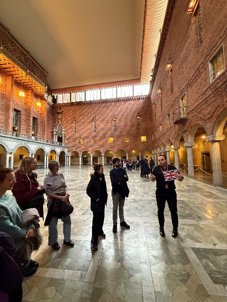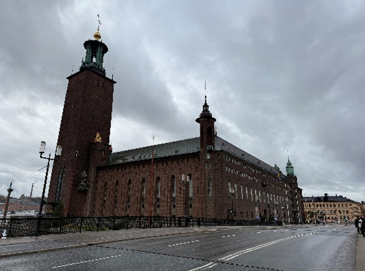 市政廳不僅是斯德哥爾摩市政府的辦公地點,更是藝術與文化的重要象徵。由於預算與設計師更動,建築在施工過程中出現了與原始構想不同的部分。 館內最著名的三個廳分別是藍廳、金廳和議會廳。藍廳原本計畫粉刷成藍色,但建築師後來決定保留紅磚本色,展現質樸的建築之美,所以藍廳其實是紅磚色的。這裡最為人熟知的,是每年12月10日舉行的諾貝爾獎晚宴。當天是諾貝爾逝世紀念日,典禮在斯德哥爾摩音樂廳頒獎後,得主與王室成員、貴賓約1,300人齊聚藍廳享用盛宴,餐後再移至金廳舉行舞會。金廳以一千八百萬片金色馬賽克裝飾牆面,由藝術家 Einar Forseth 設計,描繪瑞典歷史與神話故事,中央的「梅拉倫湖女王」象徵斯德哥爾摩的靈魂。議會廳則是市議會開會的地方,其屋頂設計靈感來自維京船的龍骨,雖為混凝土梁結構,卻以仿木漆面呈現,體現瑞典工藝與傳統精神。