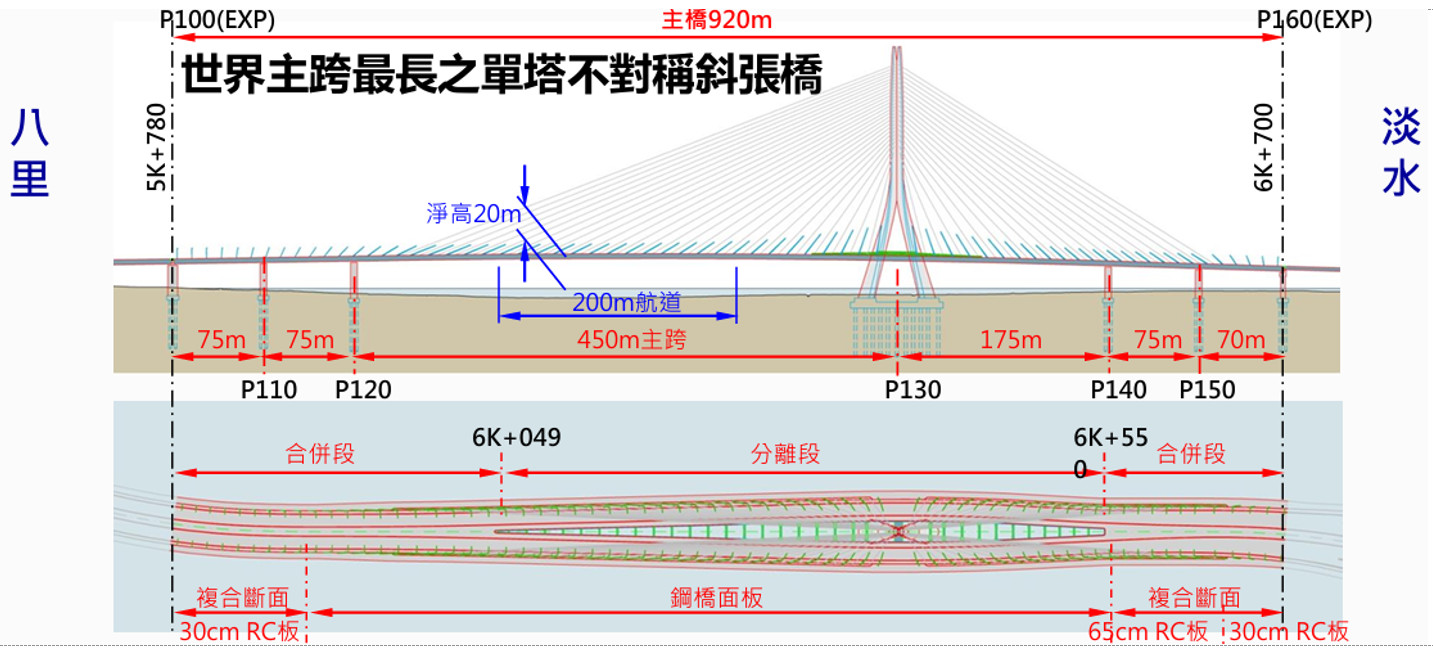 台61線淡江大橋連結淡水及八里,為新北市淡海新市鎮發展之關鍵運輸樞紐,該橋之主跨徑採單塔不對稱斜張橋之橋型,主橋塔高達211m、基礎深100m。從基礎開挖及基樁施作、橋墩構築、橋面板組立、施拉斜拉索等,面臨各種高風險作業,難度可謂近年國內橋梁工程之最。施工團隊透過風險評估、研擬安全優化對策、克服諸多挑戰,於114年9月完成主橋最後一節塊吊裝並於10月完成全橋閉合。本工程榮獲114年金安獎特優殊榮,其中主橋塔及橋面等高風險工項之施工安全優良作為,頗值得分享,在此擇要闡述供技師先進卓參精進。