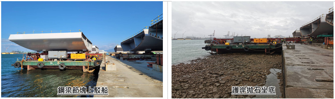 採用「平台船坐底工法」將駁船透過灌水船艙及護岸拋石整平,使其穩固地座落在海床上,拋石平台與地組場軌道平順相接,作為穩定臨時工作平台,相較傳統浮動平台,具有以下優點: