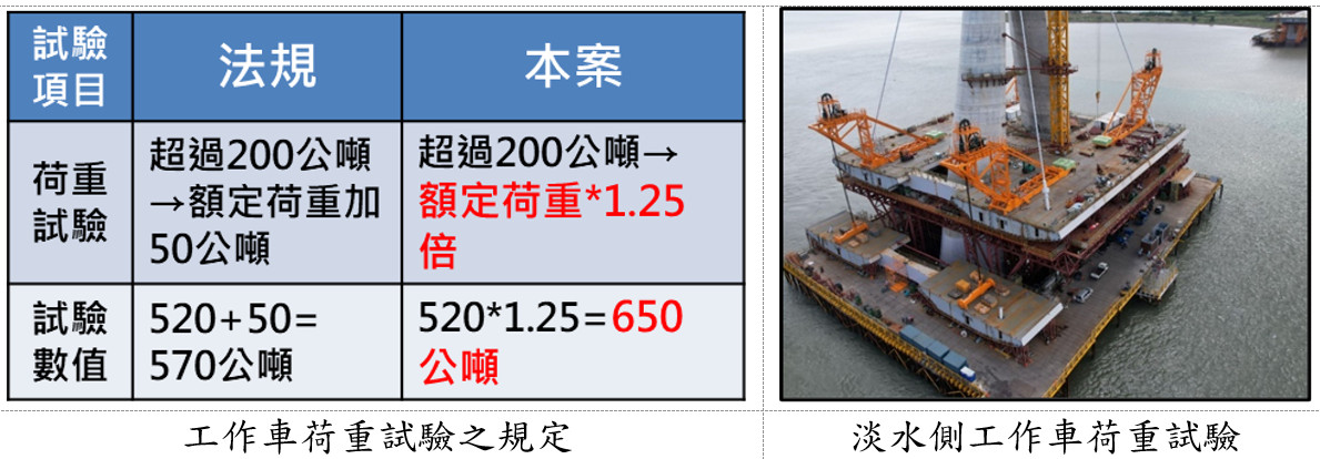 本工程採用懸臂吊裝之鋼梁節塊最重達520公噸,若發生意外,造成人員傷亡及財產損失難以估計。為確保安全,於懸臂吊裝作業前訂定650公噸的荷重試驗,利用第一個節塊(淡水端:365公噸、八里端:382公噸)加配重塊達到650公噸,並由中華起重升降機具協會輔導及驗證合格。