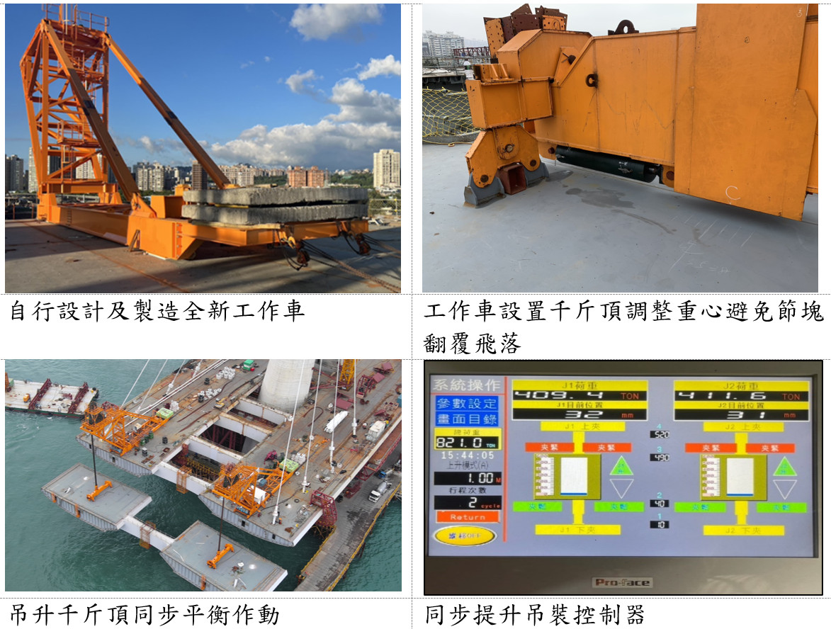 為避免這些問題,施工團隊訂定嚴謹之重心調整機制,精確計算重心位置,銲接吊耳,並在正式吊裝前進行低空試吊,確認吊點準確性,並於吊具上設置千斤頂,透過微調千斤頂,確保吊點與重心一致。另懸臂吊裝工法中,工作車的核心吊裝作業需要液壓千斤頂的同步運作來實現,故導入「電腦監控同步吊裝控制器」,達成以下目的:
