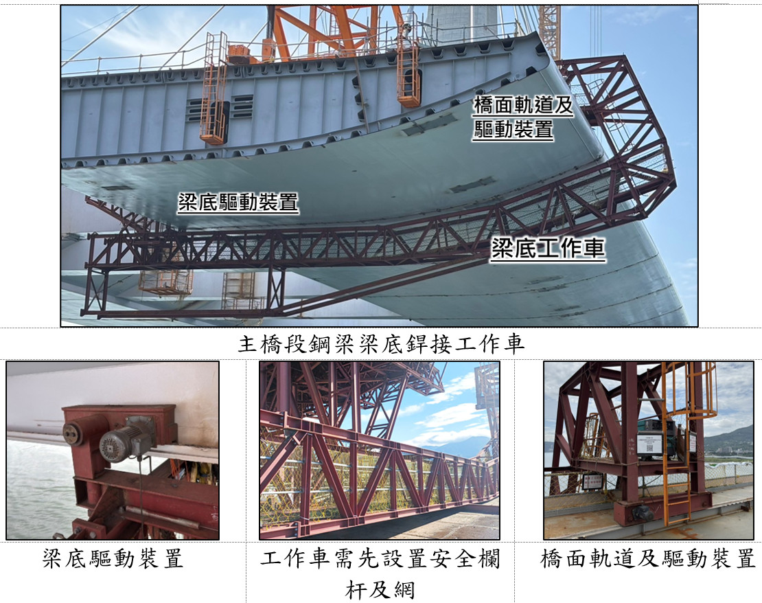 為使人員於鋼橋底部能安全穩定進行銲接與塗裝作業,特設置梁底銲接工作車(可供5人作業/限重200kg/m²),且工作車在吊裝使用前需先設置安全欄杆及安全網。該工作車可沿預設軌道隨節塊推進同步前移,提供穩定的人本高處作業平台,提升施工效率並確保作業人員安全。