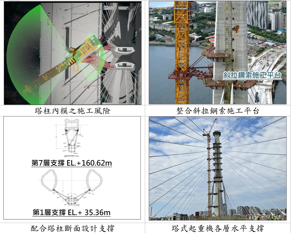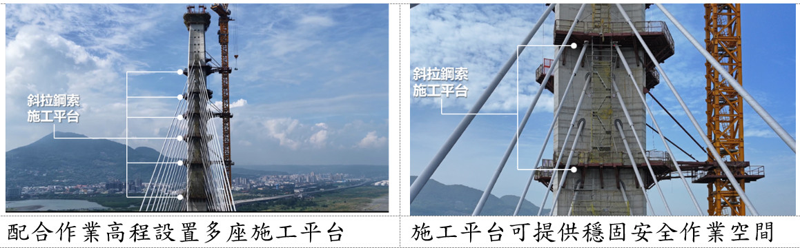 本工程結構系統採全漂浮式設計,於橋塔EL.+100m至EL.184m設有八里側27對、淡水側20對斜拉鋼索,將鋼橋重量傳遞至主橋塔。為確保斜索施工人員之作業安全,整合塔式起重機之水平支撐結構,設置斜拉鋼索施工平台。該平台提供穩固之高處作業空間,可供斜索安裝與調整作業,不僅對墜落危害防治甚有助益,且提升施工效率。