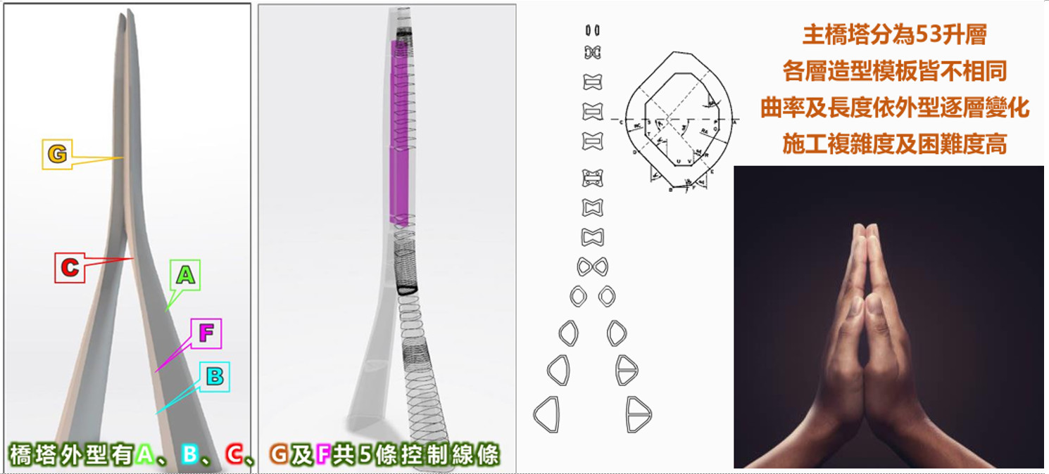 圖1為淡江大橋主橋之平、立面及標準斷面圖,全橋920m、主跨徑450m,橋址位於淡水河口,故主跨預留200m供作船舶航行。主橋塔P130為3D曲面變斷面造型,自海平面起算橋塔高211m,如圖2,係有祈福之意象。因橋址位於出海口,不論樁基礎、3D曲面橋塔及橋面板等施工皆具高風險及挑戰,施工團隊周延研擬施工風險防治對策後落實執行,以此參加114年優良工程金安獎評比獲特優之殊榮,爰將相關優良安全作為分享技師先進,共琢磨精進。