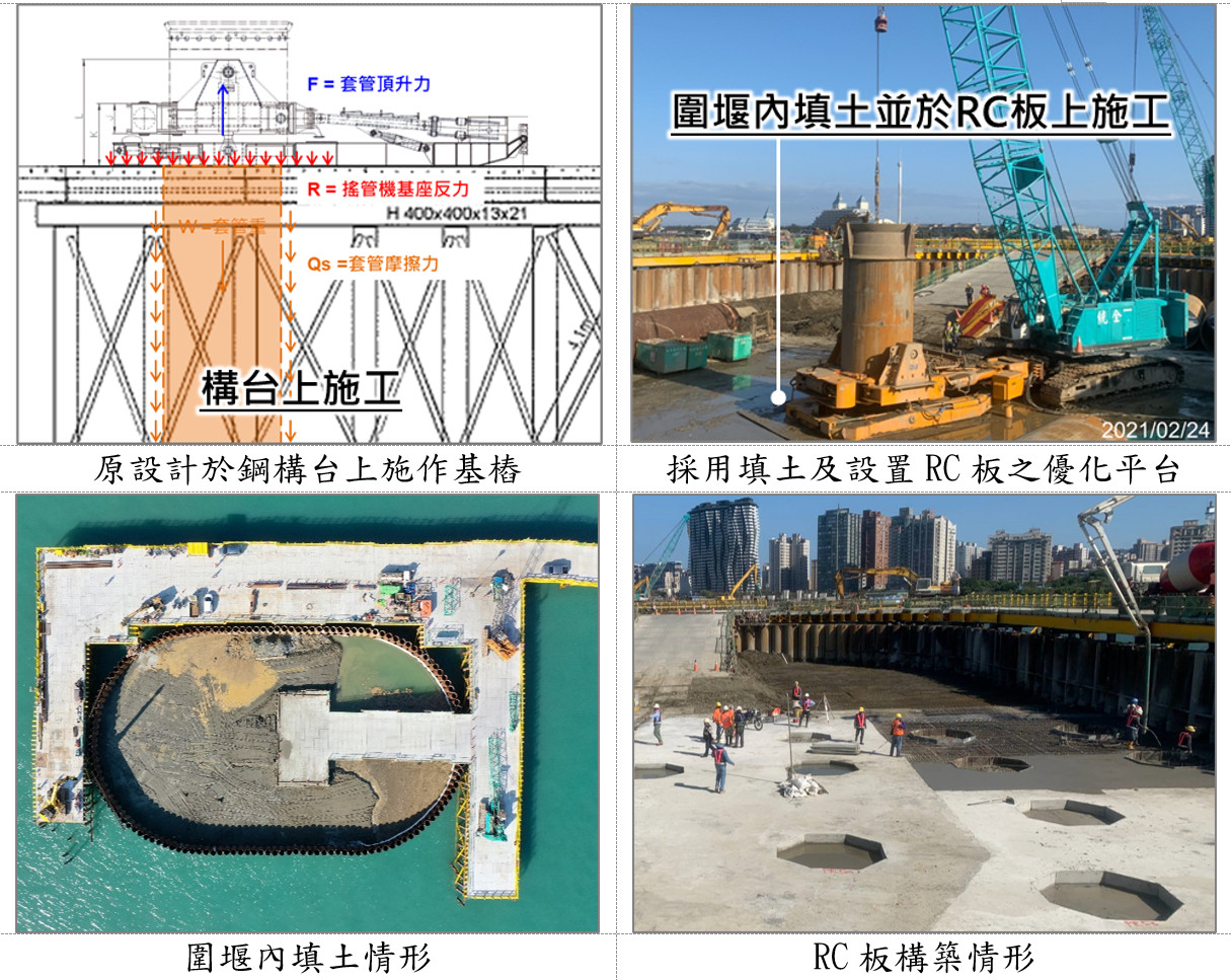 設計階段經風險評估,考量主橋塔基礎位於淡水河口波流交會區,採用圍堰乾式施工,另主橋塔基礎採用樁徑2.5公尺、樁長65公尺,樁底高程-81.5公尺之全套管基樁,因基樁尺寸較大,故搖管機起拔套管時需較大反力,原規劃之施工構台高度達15公尺,勁度較小,構台恐因承載力不足導致沉陷,進而造成機具傾斜或翻覆風險。為提升作業穩定性,以圍堰內填土構築RC版取代傳統構台,增加地面承載力,確保基樁施工期間機具作業穩定,提升施工安全。