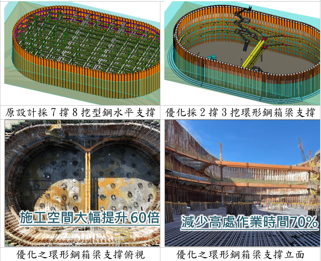 本工程主橋塔基礎圍堰原採傳統型鋼支撐,須進行「7層支撐8階開挖」,作業繁複且高處作業風險高。優化後改用環形鋼箱梁支撐,結構剛性提升,施工簡化為「2層支撐3階開挖」,有效減少支撐組拆次數與高處作業時間,降低墜落與倒、崩塌風險。