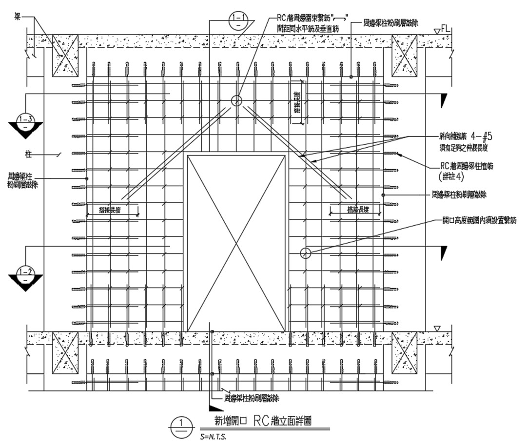 | 鋼筋混凝土結構板及牆開孔角隅斜向筋補強的必要性探討 陳正平 技師 摘要 在探討鋼筋混凝土結構板及牆開孔角隅斜向加強筋的議題時,開孔角隅的斜向補強筋配置經常成為設計與施工間討論的焦點。斜向加強筋的主要目的是減小開孔角隅應力集中而產生的潛在裂縫,提升結構整體的使用性與耐久性。然而,實際配置時需考量板牆厚度、現場施作空間及混凝土澆置的難易度,過多的斜向加強筋反而可能造成施工困難與品質問題。因此,斜向加強筋的必要性與配置方式,應根據結構受力模式、設計圖說要求及現場條件綜合評估其必要性,以達到安全、經濟與可施工性的最佳平衡。本文討論了鋼筋混凝土結構中開口補強的方式,特別針對斜向加強筋的必要性與現場實務考量。另由本文所舉「耐震橫膈樓板」案例都沒有配置角隅斜向加強筋,為何「非結構構材」需要配置斜向加強筋?筆者建議根據實際需求斟酌斜向加強筋的配置,避免過度設計,並強調結構傳力行為與孔邊補強筋須有足夠錯位搭接長度的重要性。 一、前言 近日筆者參與耐震標章施工察證工作時,對於非結構牆壁上的門窗開孔角隅斜向加強筋根數不足(見照片1),施工單位的解釋理由是非結構牆的板厚較小,若依設計圖的規定施作二層角隅斜向加強筋,將會導致灌漿困難産生蜂窩,反而容易産生斜裂現象。嗣後在技師專業群組中提出討論,有幾位技師提出斜向加強筋有其必要性的看法,且強調各公會的板及牆的標準圖上對板及牆的開孔角隅均有配置斜向加強筋。反而沒有人提到沿矩形孔邊二正交方向補強筋的重要性,且多位技師所提供的佐證文獻參考圖例亦均未見有配置沿矩形孔邊二正交方向補強筋,筆者甚感詫異。不可否認的,增加配置角隅斜向加強筋有助於降低對角向斜裂紋發生的機率或減小裂縫寛度,但若將斜向加強筋當作主要鋼筋,反而忽略沿矩形孔邊二正交方向補強筋的鋼筋量或錯位搭接所需長度的重要性(結構牆未配置沿矩形孔邊二正交方向設置補強筋示意圖見圖1),則會有本末倒置之嫌。至於斜向加強筋的受力行為及設計方法,以及斜向加強筋的配置數量等問題經筆者提出討論,亦沒有人能提出如何計算斜向加強筋數量的計算方法,可見斜向加強筋不在設計計算範圍,可有可無並非必要。筆者認為不論是結構或非結構之牆與板,均有多種受力模式,專業技師設計開孔補強時,應根據各種實際受力模式情況與施工條件逐一檢核,靈活選擇補強方式。斜向加強筋雖有助於在某些特殊受力情境下提升抗裂能力,若現場施工空間有限,或沿矩形孔邊二正交方向設置之主要補強筋配置量已能有效承受力量,則可視情況減少斜向加強筋,避免材料浪費與施工困難。當然最終設計仍需兼顧理論分析與現場經驗,確保結構安全性、施工性與經濟性。 筆者曾參與多個技師公會的鋼筋混凝土結構及鋼結構標準圖的修訂工作,早期的鋼筋混凝土結構標準圖大都參照日本一些施工相關的工具書,經筆者深入了解認為此些工具書的内容大都以施工方便性或解決施工問題為出發點,對結構力學的考量甚為欠缺,筆者多年來也提供了很多配筋細部的改進構想,大幅修訂及推廣幾乎已全部改變早期版本,成果也漸為大家所接受。惟最近發現有部分鋼筋混凝土結構標準圖的版本有將甚多標準圖的配筋方式改回早期版本的現象,建議技師先進選用時宜詳加比對確認後再選擇採用。本文探討鋼筋混凝土結構板及牆開孔角隅斜向加強筋的必要性供技師設計參考,不當之處亦請工程先進不吝指正。