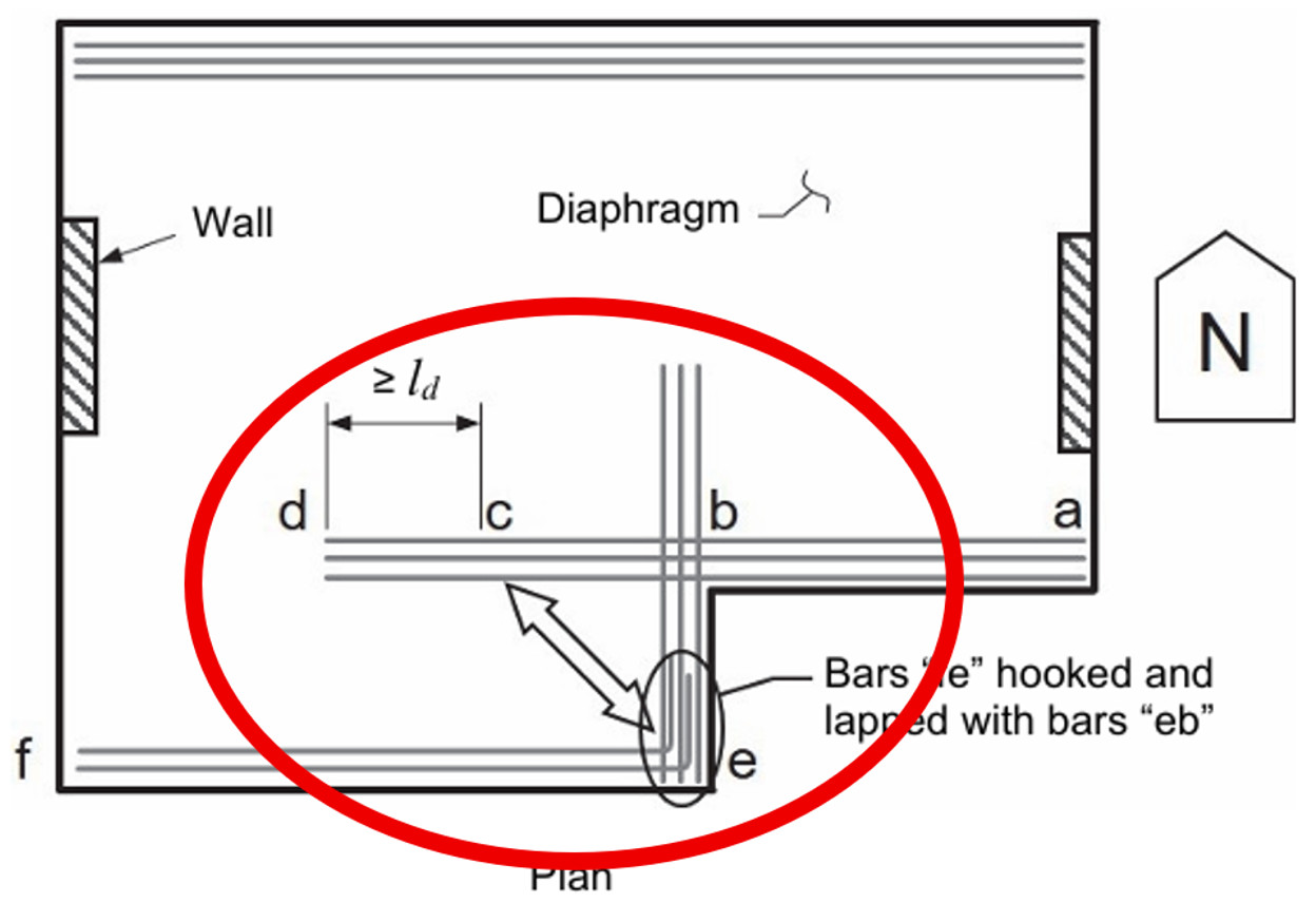 除了補足被開孔截斷的版鋼筋外,其二端延伸長度,除須滿足搭接長度外,因補強筋與被截斷的板鋼筋間有相當大的錯位距離,可能之最大的錯位距離為垂直於補強筋方向之孔邊尺度之半,再加孔邊鋼筋保護層約5cm,因此除了搭接長度外,尚須考慮錯位搭接效應建議增加至少為橫向孔邊長之半,才能滿足錯位搭接長度的需求。此觀念筆者數十年前首創提出後已漸為各界所接受。惟現行《建築物混凝土結構設計規範》第25.5.1.3節規定:「對於受撓構材中之非接觸續接,續接鋼筋之側向心至心間距不得大於所需搭接長度之1/5與15 cm之小值」,但實務上錯位距離大於「所需搭接長度之1/5與15 cm之小值」的機會非常多,且現行《建築物混凝土結構設計規範》第17.5.2.1節已有提及具標準彎鉤之錨栓錨定鋼筋與擴頭錨栓間之錯位搭接的概念(惟其以「伸展長度取代搭接長度」與第25章之規定不符),其錯位所需延伸長度係依35°拉破破壊錐計算,筆者建議比照梁式剪力及貫穿剪力之規定採用45°拉破破壊錐計算。照片2雖為板之暫時開孔,惟考量彎起之原板筋將來扳回板面時無法回復平直狀態,建議完全由沿開孔邊緣正交方向的二側面補強筋以錯位搭接長度傳力機制承受。如此作法已完全符合板面外受力的結構力學行為。至於是否需要斜向加強筋?須考量施工性及抗撓有效深度,可以免除或採增加沿開孔邊緣正交方向的上、下層補強筋來替代,可使施工性更為簡易、有效。因為開孔邊緣二正交方向的補強主筋已代表結構力學所需全部鋼筋。就如樓板的角隅補強筋,可採用對角斜向補強筋,亦可採用平行孔邊方向的補強筋,依據現行《建築物混凝土結構設計規範」第8.7.3.1.1節規定:「 因角隅效應引致之因數化彎矩Mu,應假設其作用軸線,在板頂面係垂直於該角之對角線;在板底面則平行於該角之對角線」。第8.7.3.1.2節規定:「角隅鋼筋應沿各方向配置,範圍自角隅至較長跨度之1/5距離內」。第8.7.3.1.3節規定:「角隅鋼筋在板之頂面者須平行於該角之對角線,底面者須垂直於該對角線。另者,角隅鋼筋應在板頂與板底處,各配置兩層平行板邊之鋼筋網。」 筆者鑒於樓板的斜向角隅加強筋僅能配置於上、下二正交主筋之間,其位置已接近板之中性軸,有效深度不足,因斜向加強筋之配置目的與撓曲應力有關,需有足夠的有效深度,斜向加強筋配置於板之中性軸已失去補強意義。筆者多年來已將標準圖中板之角隅對角向之補強方式去除,由此可證板之開孔補強只須配置平行二正交主軸方向,無需再重複配置對角向補強筋。若設計者認有需要可再沿開孔邊緣正交方向的上、下層補強筋中,增加補強筋量,其45度分量亦可達到斜向防裂的目標,其原理即為沿開孔邊緣正交方向的上、下層增加補強筋量的45度分量,二向相加可提供0.707×2=1.414倍的斜向補強效果。因二向的45度分力已可提供斜向的防裂功能,所以斜向筋可有可無。且斜向筋在內外二鋼筋網間只能勉強配置單層,就如樓板角隅補強可採斜向(對角)補強亦可平行板二向主筋配置。 至於承受橫膈板之面內剪力之板開孔,須採用壓拉桿模式設計拉桿及壓桿以及相交結點的伸展錨定,壓拉桿模式可參考現行《建築物混凝土結構設計規範》第23章(壓拉桿方法),惟其中因壓拉桿相交結點的伸展錨定不易提供必需之伸展錨定空間,因此筆者不建議採用壓拉桿模式設計。另外一種方法為梁柱構架模式,亦即一般的〝冂〞字形梁柱構架或〝囗〞字形梁柱構架,考量因通過開孔處剪應力,及剪力產生之次彎矩。其設計結果須在開孔邊緣配置抗撓曲邊構材及從開孔角隅處起算須有足夠的錨定長度(並非符合伸展長度即可),其錨定長度為壓拉模式結點區起算一伸展長度,其伸展錨定長度之正確配置方法見圖2所示;伸展錨定長度亦可採與鄰近轉接鋼筋(圖2中之e-f鋼筋)間之錯位搭接長度計算。在此特別提醒讀者,現行《建築物混凝土結構設計規範》圖R12.5.2.3(符合第12.5.2.3節抵抗彎矩與軸力所引致拉力之非預力鋼筋位置)之伸展錨定長度標示有誤,無法滿足傳力需求,筆者在參加新版規範修訂委員期間曾有提出指正惟未被接受,建議讀者須特別注意。同樣若設計者認為圖2中有加強角隅斜向補強筋時,亦可在沿開孔邊緣正交方向的上、下層增加補強筋量亦可達到防斜裂的目標,其原理亦即為沿開孔邊緣正交方向的上、下層增加補強筋量的45度分量可提供1.414倍的斜向補強效果。