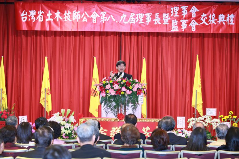 前行政院長游錫表示,很高興參加今天的交接典禮,長期以來受土木技師界的幫忙,藉此機會向大家表達感謝與敬意。談到土木技師無所不管,日照照得到或照不到的,土木技師都管得到,與任何工程長相左右,土木技師專業水準對國家進步與時俱進。擔任院長時,不管雪山隧道、整治基隆河、東西向快速道路等,除政府政策外,都是工程界與技師界的努力與幫忙提升競爭力,才能看到國家建設順利完成。談到林理事長與施理事長表示,兩人都溫文儒雅、熱誠進取,並感謝林理事長過去的貢獻,施理事長接任後省公會會務能蒸蒸日上,5都成立正是未來共同努力的,相信施理事長可以做得很好。
