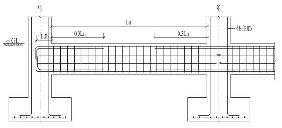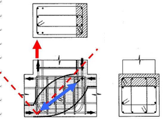2、地下室筏基版 有完整地下室外牆時,地震力在地面以下各樓層受到地下室外牆的束制,致地下室各樓層幾無側向位移產生,因此柱底之彎矩甚小,致柱底鋼筋之錨定需求不高,因此柱鋼筋底部彎鉤方向朝內或朝外均可。 3、剪力牆邊構材(沿剪力牆面內方向) 剪力牆邊構材沿剪力牆面內方向之側向位移受到剪力牆的束制,故剪力牆邊構材主鋼筋底部之彎鉤在沿剪力牆面內方向朝內或朝外均可。 4、基礎版或地梁之深度較深 (例如有深地梁之筏基或厚版基) 或柱底彎矩較小致柱受拉側之鋼筋群進入基礎或地梁內之直線段所能帶動之接頭區內混凝土之剪力強度(可含剪力筋之剪力強度,但不含接頭區受壓桿之貢獻) 可大於柱受拉側之鋼筋群之總拉力時,此時柱鋼筋底部彎鉤方向朝內或朝外均可。惟現行「結構混凝土設計規範」第15.6.3.1節規定:常重混凝土構材接頭之剪力計算強度不得大於下列規定。 (a)、接頭四面皆受圍束=5.3 (b)、三面或一雙對面受圍束=3.9 (c)、其他=3.2 Aj=梁-柱接頭剪力有效面積;fc’=混凝土28天齡期抗壓強度。 其中,三種狀況之剪力強度均為已合併「混凝土之剪力強度,與接頭區受壓桿之貢獻」,因此,本條件實務上很難分離出混凝土之剪力強度,與接頭區受壓桿之貢獻。