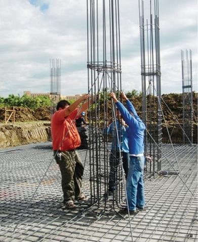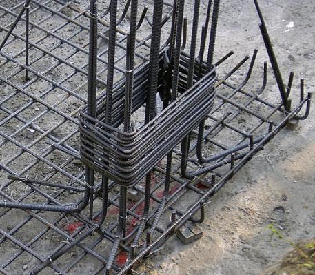 由照片1中,基地周邊低於周圍地表高程之情況顯示,該基礎應為地下室或半地下室之情況,此種情況若基地四周有完整外牆可抵抗地震力,外跨地梁之外端亦假設為鉸接,則因柱底無抵抗地震力彎矩需求,柱鋼筋底部彎鉤方向可朝外。但若該基礎為無地下室之版基,地震力在柱底產生的彎矩最大,則該柱筋與基礎版間之接頭有抵抗地震彎矩之錨定需求,則柱鋼筋底部彎鉤方向須朝內。 至於60cm x 60cm 的柱底鋼筋彎鉤向內彎時,#8鋼筋標準彎鉤長度是42cm,而柱底鋼筋錨定空間只有50 cm,兩對向鋼筋之彎鉤向內彎時,會造成彎鉤鋼筋密集並排,致無足夠空隙灌漿的問題,則須加大柱斷面尺寸,以避免造成施工困難或品質不佳的問題。惟由照片2中鋼筋比不大之案例顯示,縱使柱鋼筋底部彎鉤朝內,亦尚不致導致灌漿困難,或喪失混凝土握裹力的問題。惟柱鋼筋底部彎鉤朝內,鋼筋籠的穩定性明顯變得不佳,須增加側撐等穩定措施,才能防止發生勞工安全意外事件。另外,柱鋼筋底部彎鉤朝內的目的主要係為了要彎鉤內側鉤住接頭區混凝土受壓桿,及須防止彎鉤伸直致鉤住接頭區混凝土受壓桿的效果不佳,但此處柱鋼筋底部彎鉤的下面有版之下層鋼筋網圍束,較無彎鉤伸直的疑慮。 照片2 柱筋鋼筋比不高,彎鉤若朝內綁紮尚不致導致灌漿困難案例[1]