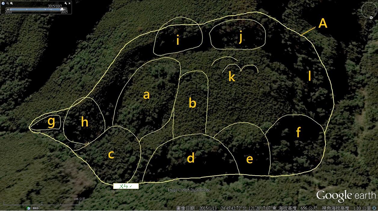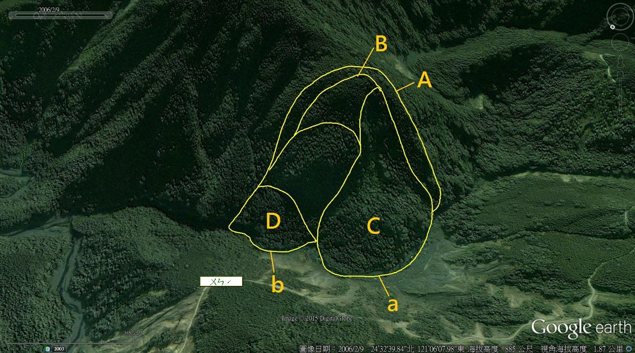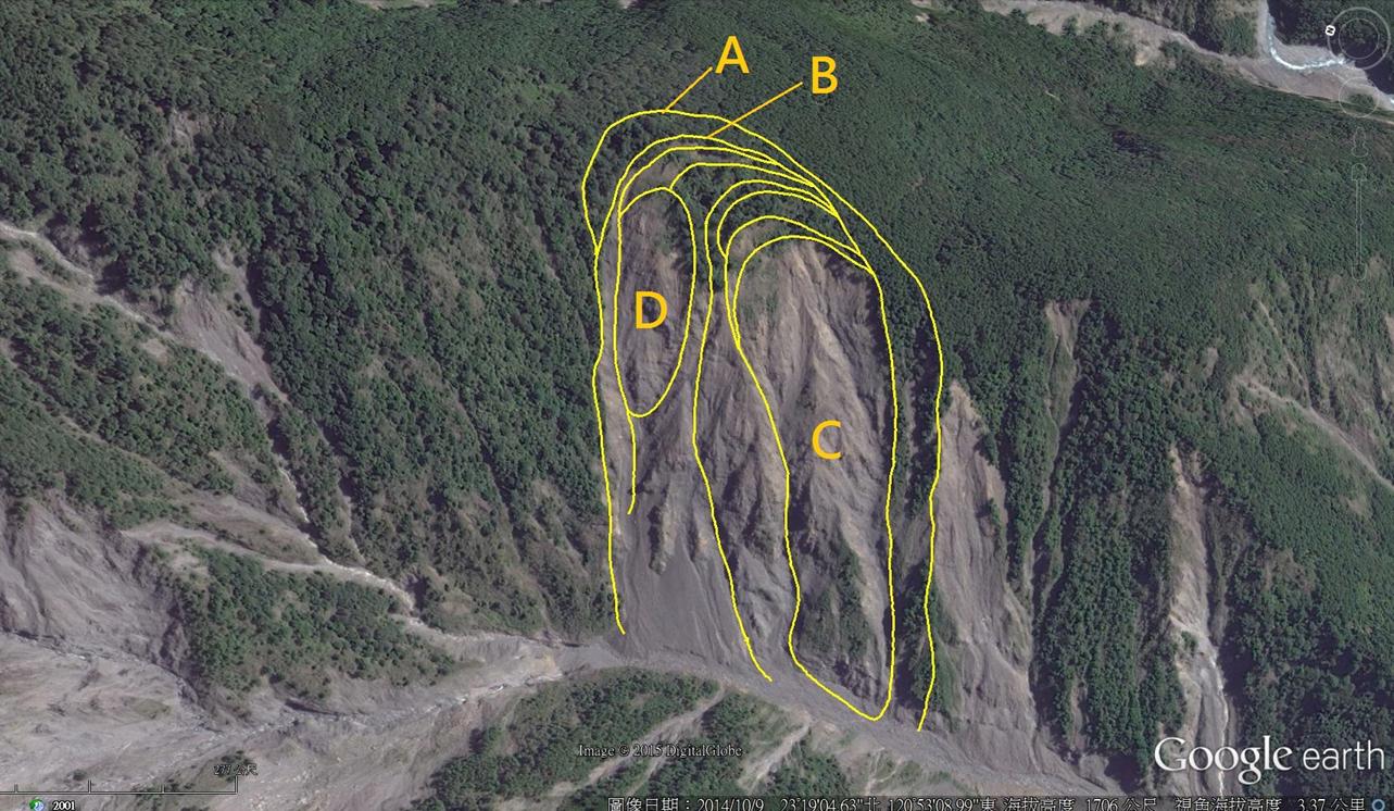 可與其外圍做出明顯的區隔。在其體內則不斷的發生小規模滑動,從a 至j都是。它們發生的先後順序可以從截割關係予以判斷,即被截斷者發生在先,例如a被c所截斷,所以a先發生,然後c才發生;又如d既切割b又切割e,所以d是最後發生。注意每一個小滑體的冠部都有明顯的弧型張力裂縫;而k處雖然已經出現了3條張力裂縫,但是兩側的剪力裂隙尚未完全成形,表示小滑動正在醞釀當中,假以時日仍然會出現肉眼可以發覺的滑動現象。復發帶A具有最深的滑動面,其他小滑動都只是發生在該滑動面之上的較小規模之擾動而已。那麼A的滑動面有多深?這是工程師最想知道的數據。這裡介紹一個很簡單的推測方法。從圖1可見,A的滑動面有一小部分已經出露,就是i-j的部分;而i-j 的斜度可以在現場量取,約為80∘左右,滑動面的反曲點約位於c-d-e的冠部,而剪出線則位於c-d-e的趾部; 因此可作一縱剖面,將上述幾個關鍵部位,利用試誤法,找到一個假想的圓心,將其連貫起來即得。 山崩復發帶的另外一個特徵位於其趾部的地方(即前端);因為滑體中央部位的滑動阻力比兩側的為小,所以滑距較大,遂在趾部形成弧形,狀如舌尖, 故稱為舌狀前凸(見圖2)。圖2中的A為首先形成的滑體之冠部,B為其頭部, C及D則為後來才形成的較小滑體,它們在前端都形成典型的舌狀前凸(見a及b)。舌狀前凸常將河道外推,結果形成弧形的河曲,也是辨認山崩復發帶的一個重要證據。一般而言,山崩復發帶兩翼的邊界都呈漂亮的流紋,在影像上表現為流紋線形,很容易辨認。
