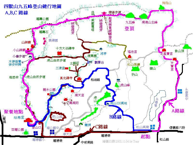 新增網頁1台灣省土木技師公會 四獸山九五峰登山健行活動通告 日期:101年6月22日 發文:(101)省土技字第2620號 主辦單位:台灣省土木技師公會 參加對象:北區會員及眷屬 時 間:101年08月11日(星期六) 報到時間:¾A路線(登頂遊)上午7:45-8:05(報到完畢);8:10帶隊出發(沿線無路條),行程約3.5小時。(逾時不候) ¾B路線(逍遙遊)上午8:00-9:00(報到完畢);8:15帶隊出發(沿路條前進),行程約2.5小時。(逾時不候) ¾C路線尋幽訪勝(高齡)遊上午9:00-10:00(報到完畢)按行政人員指示方向行走,行程約45分鐘,遊憩虎山溪,屆時入席。 預期報到人數眾多,請參加會員及眷屬提前15分鐘以上報到,逾時報到者,請自行前往。(路線圖公佈於公會網站) 報到地點:台北市松山商職(信義路側)。 報到領取:會員 T恤、路線圖、礦泉水、餐券。 眷屬 礦泉水、餐券(包含繳費後第二位以上之眷屬)。 費 用:會員及第一位眷屬請繳交參加保證金,每人500元,活動當日報到後即現場退還,未參加者恕不退款。 第二位(含)以上之眷屬每人300元(無論參加與否,恕不退款)。 ※活動當日不接受現場報名。 自 備:交通、雨具自理。 聚餐地點:中午12時入席台北市慈惠堂,素齋桌餐方式(素齋係配合慈惠堂料理方式)。地址:台北市信義區福德街251巷33號,電話02-27268141。 報名方式:即日起至08月03日(星期五)中午12時前,將報名表及劃撥單收據回傳,俾便辦理餐位及保險(意外險100萬、醫療險10萬;未填妥詳細資料者,囿於保險規定歉難辦理保險);公會劃撥帳號12295196,戶名「台灣省土木技師公會」;會員亦可上公會網站線上報名及繳款。 ※貴先進已報名06/17本登山活動者,如參加人數無增、減可不用回傳;若08/11不克出席者請電話告知,俾利辦理退費。 聯絡電話:(02)2705-0899轉11李惠華小姐,傳真(02)2705-3638。 松山商職:臺北市信義區松山路655號,公車搭乘33、46、207、257、263、277、286、299或信義幹線至「松山商職」站下車。捷運永春站4號出口沿忠孝東路五段東行右轉松山路直行至「松山商職」。