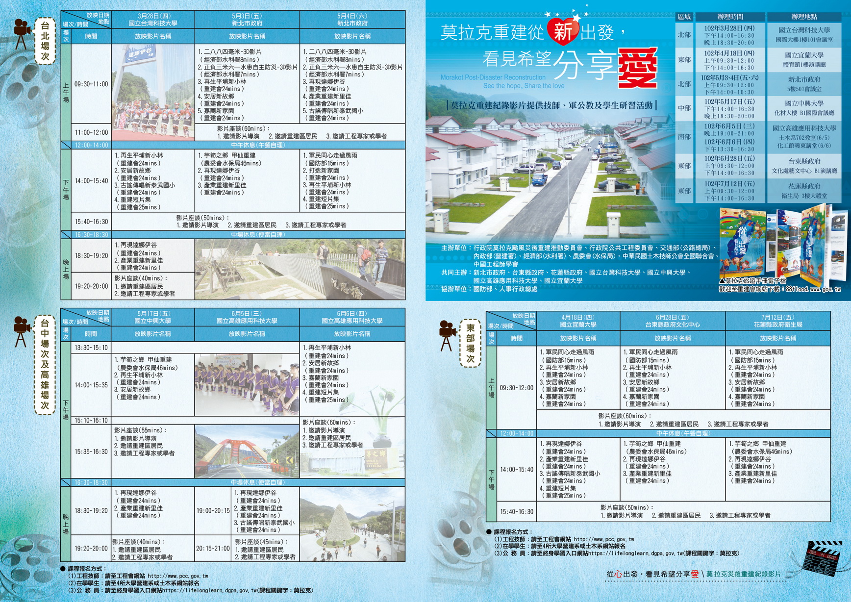 活動場次:台北-102.03.28、102.05.03-04、東部-102.04.18、102.06.28、102.07.12、台中-102.05.17、高雄-102.06.05-06課程報名方式:請至行政院公共工程委員會網站http://www.pcc.gov.tw報名
