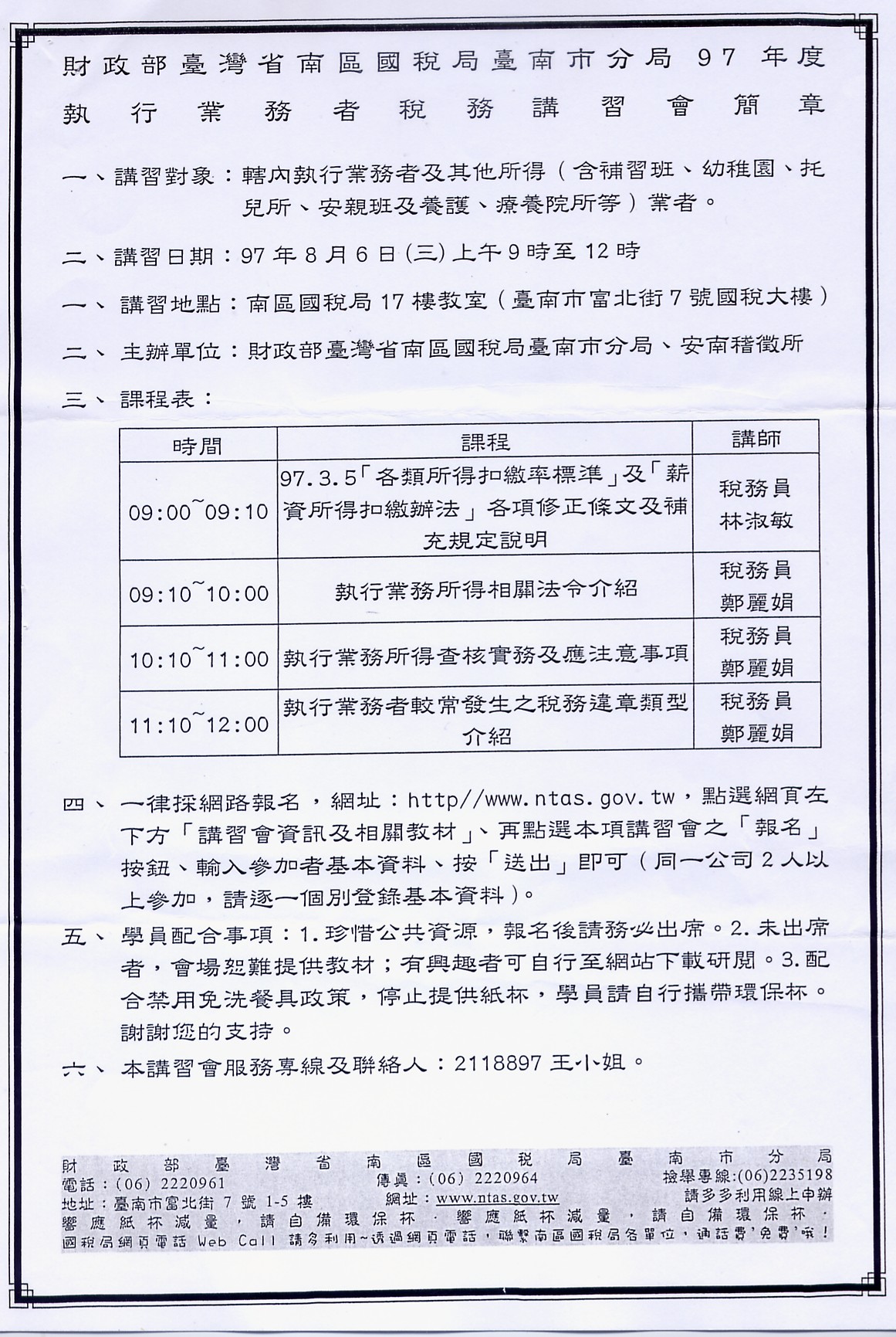 一、講習日期:97年8月6日(三)上午9時-12時二、講習地點:南區國稅局17樓教室(南市富北街7號)三、主辦單位:財政部南區國稅局台南市分局、安南稽徵所四、本講習會服務專線及聯絡人:06-2118897王小姐課程表:09:00~09:10各類所得扣繳率標準及薪資所得扣繳辦法各項條 文修正。09:10-10:00執行業務所得相關法令介紹10:10-11:00執行業務所得查核實務及應注意事項11:10-12:00執行業務者較常發生之稅務違章類型介紹