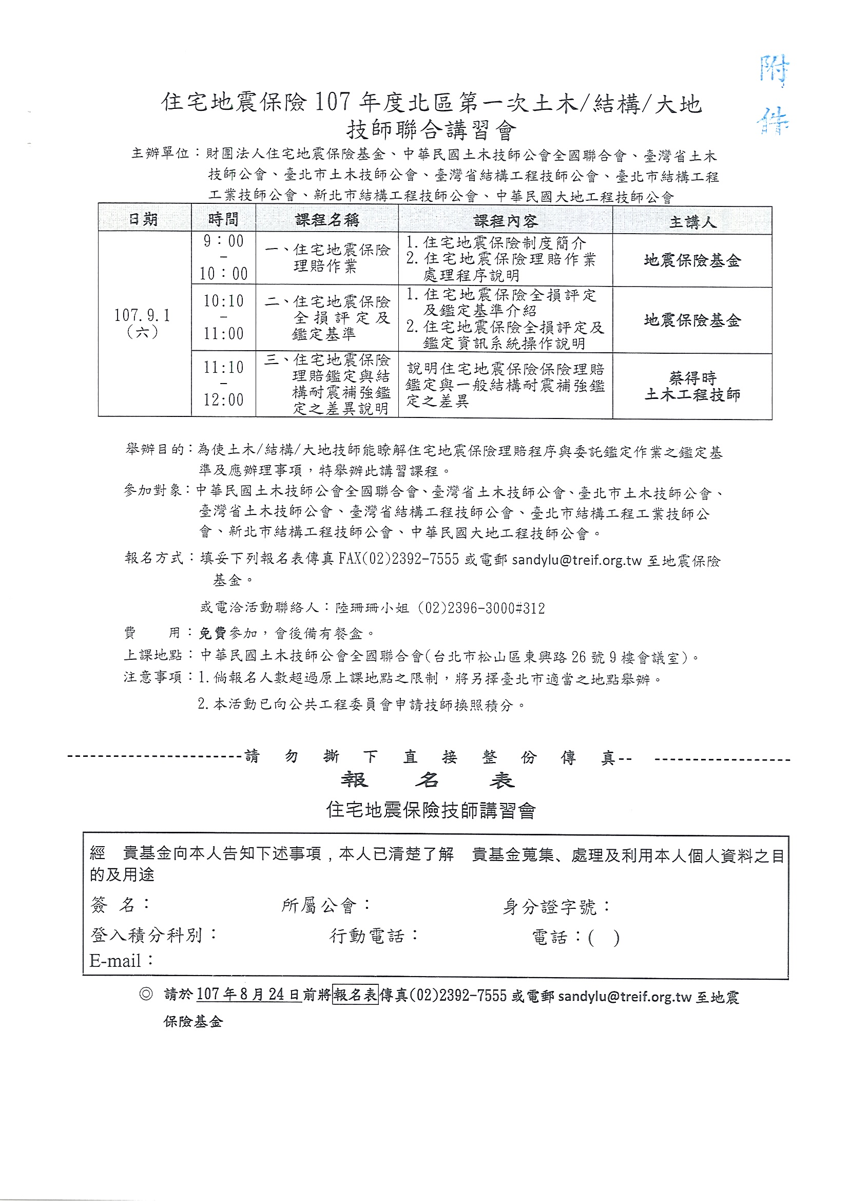 報名方式:填妥下列報名表傳真至地震保險基金 FAX(02)2392-7555。 或電洽活動聯絡人:陸珊珊小姐(02)2396-3000#312