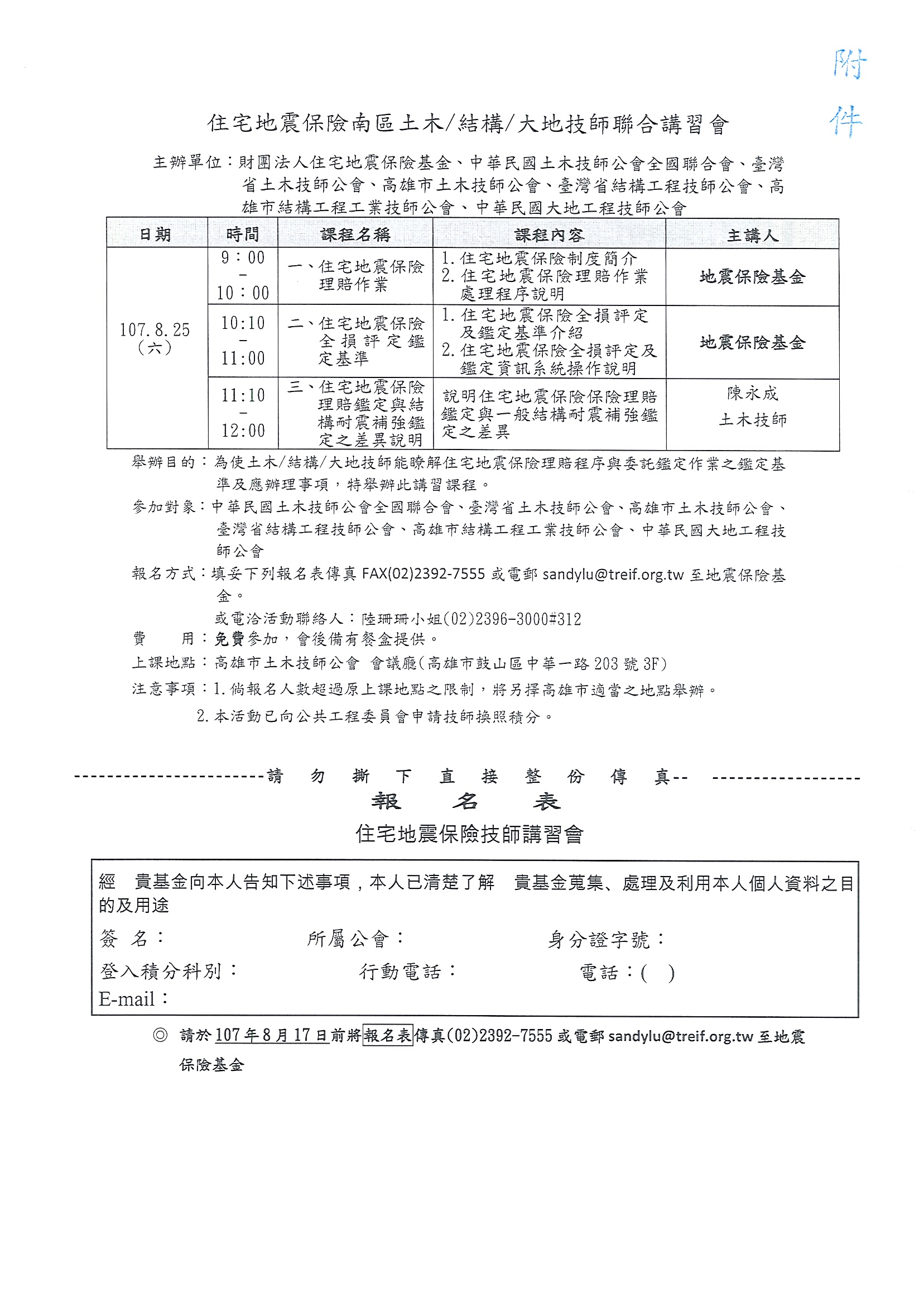 報名方式:填妥下列報名表傳真至地震保險基金 FAX(02)2392-7555。 或電洽活動聯絡人:陸珊珊小姐(02)2396-3000#312