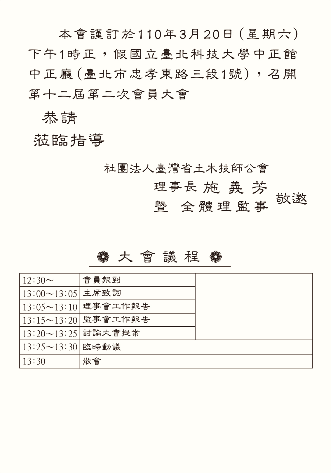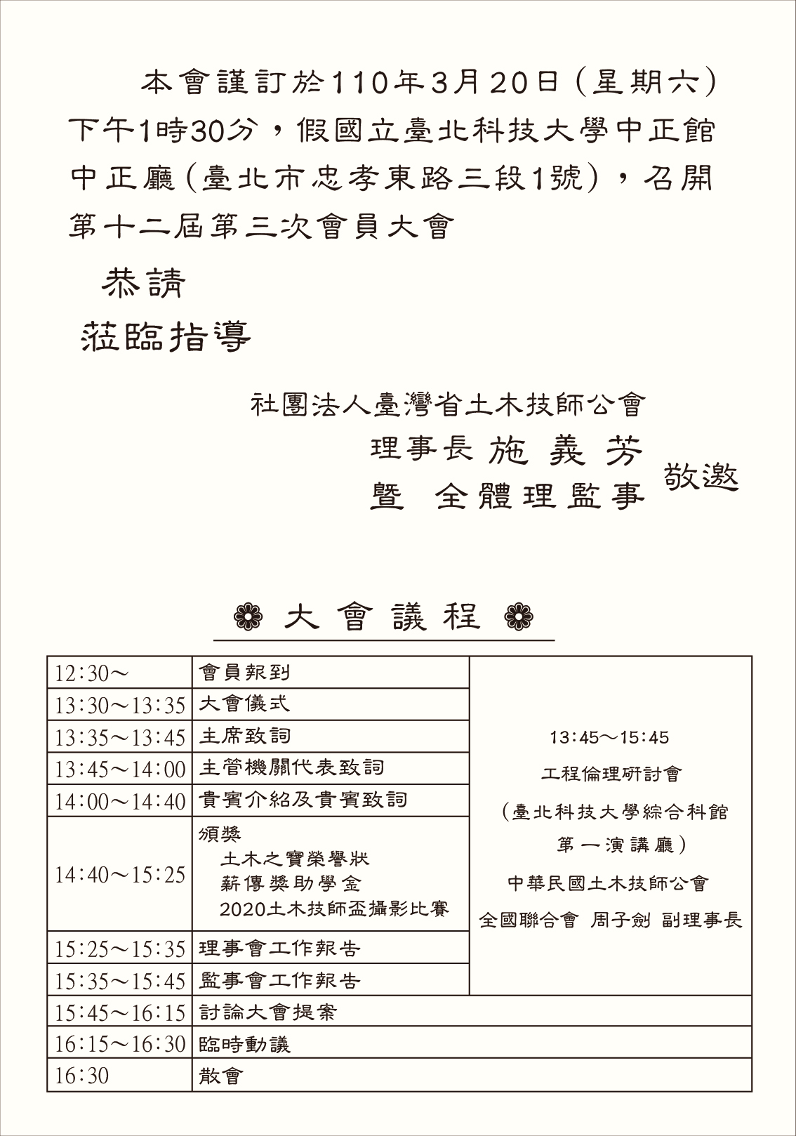 : 110.03.20 召開第十二屆第二、三次會員大會 大會邀請函