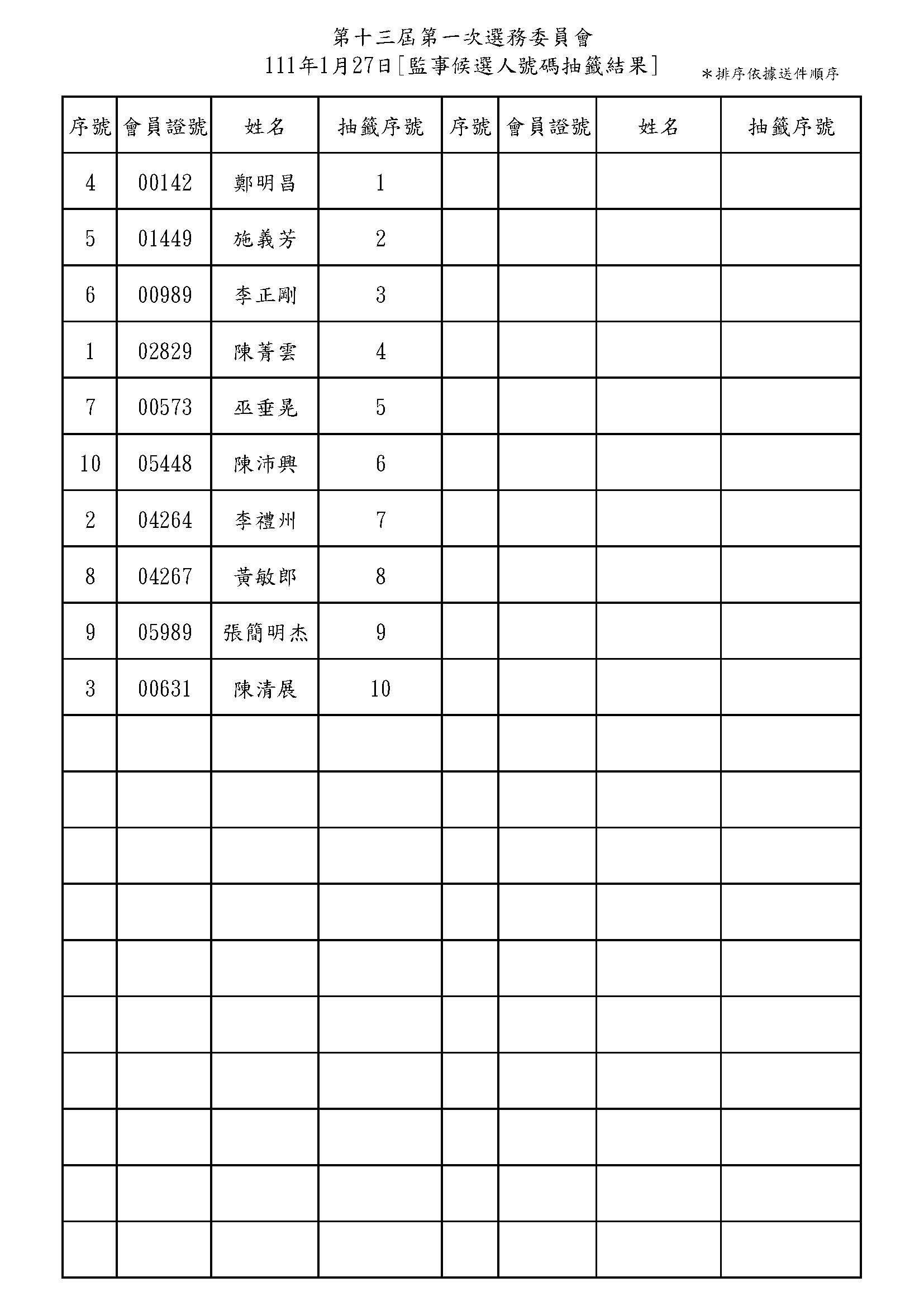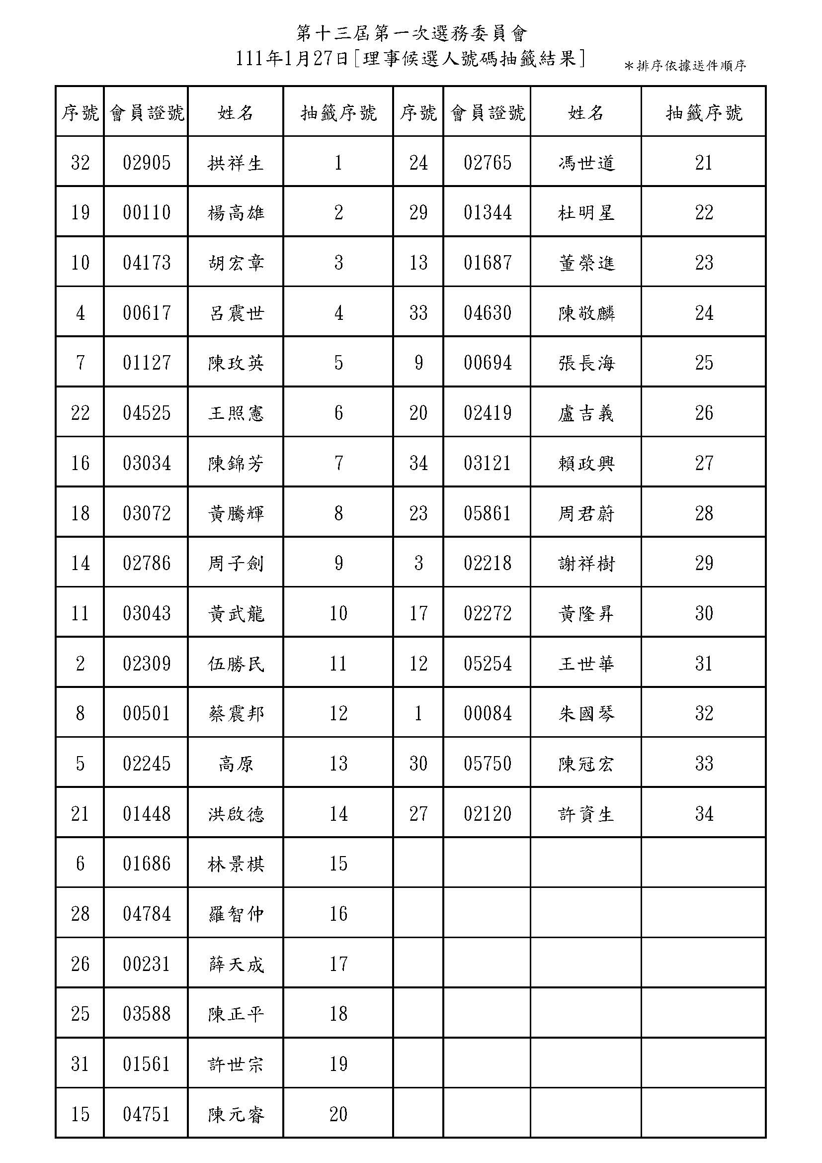 : 社團法人臺灣省土木技師公會第十三屆理監事候選人號碼抽籤結果