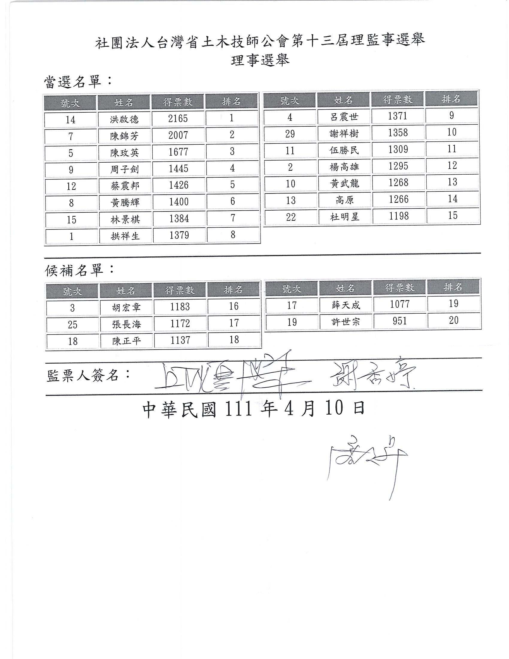 : 社團法人臺灣省土木技師公會第十三屆理、監事選舉當選名單
