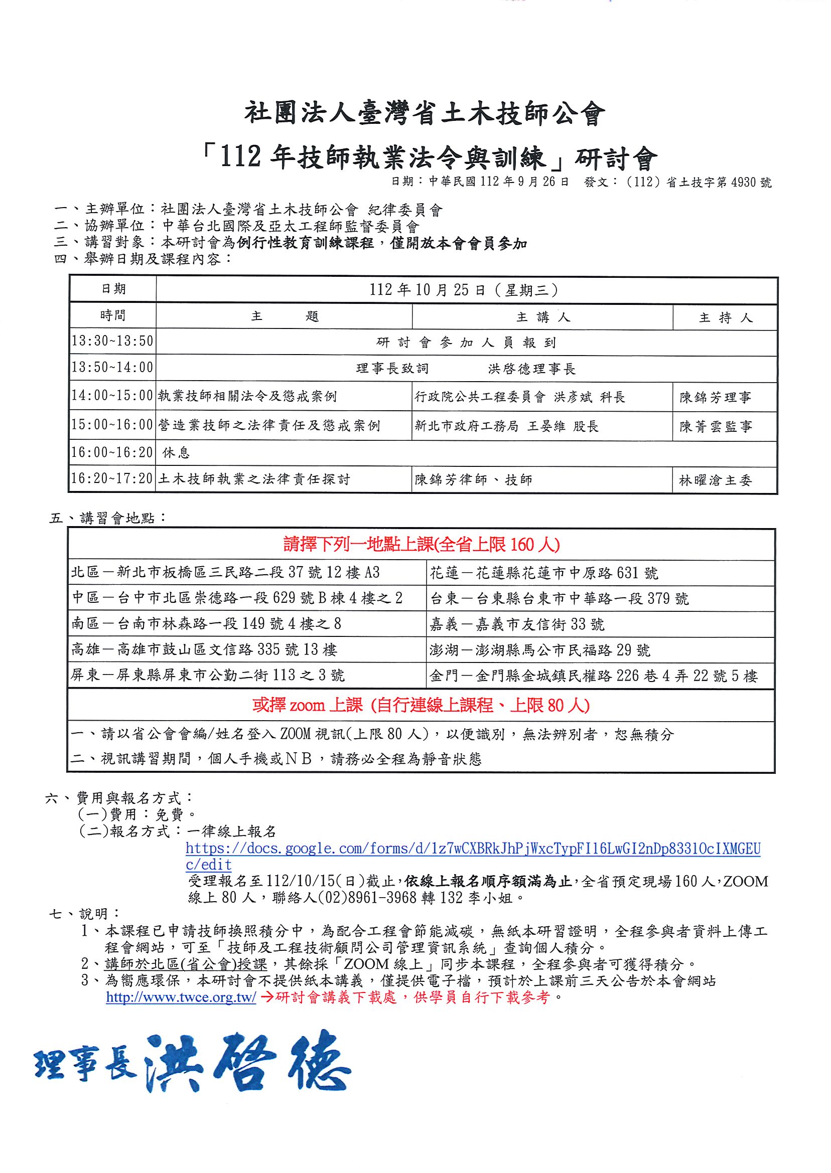 舉辦日期:112/10/25(星期三)下午:13:30~17:40一律線上報名:https://reurl.cc/9RpMnj聯絡人(02)8961-3968轉132李小姐****本研討會為例行性教育訓練課程,僅開放本會會員參加****