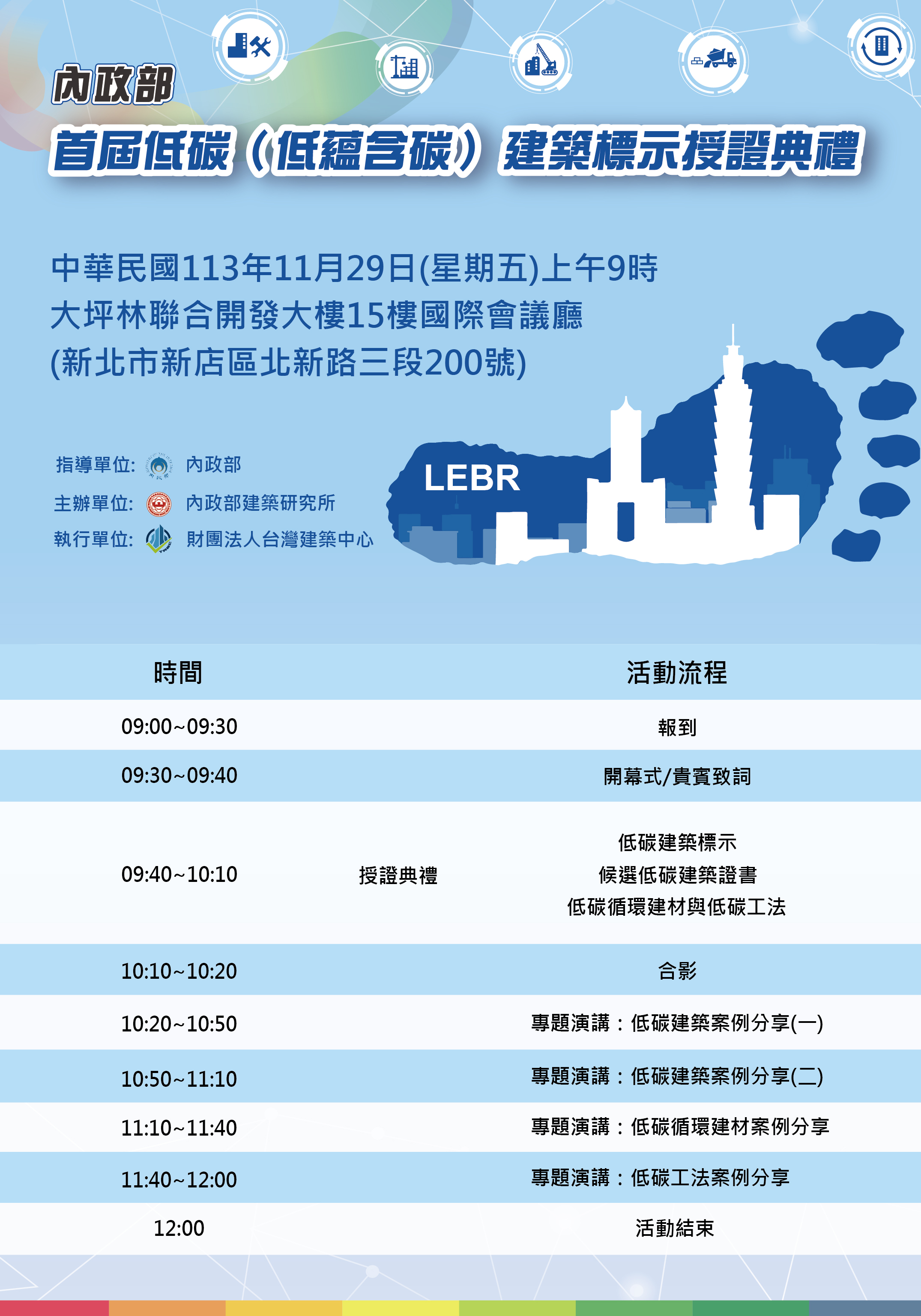 : 財團法人台灣建築中心 舉辦「首屆低碳(低蘊含碳)建築標示授證典禮暨低蘊含碳建築暨低碳循環材料及工法授證實例減碳技術解析分享會」活動