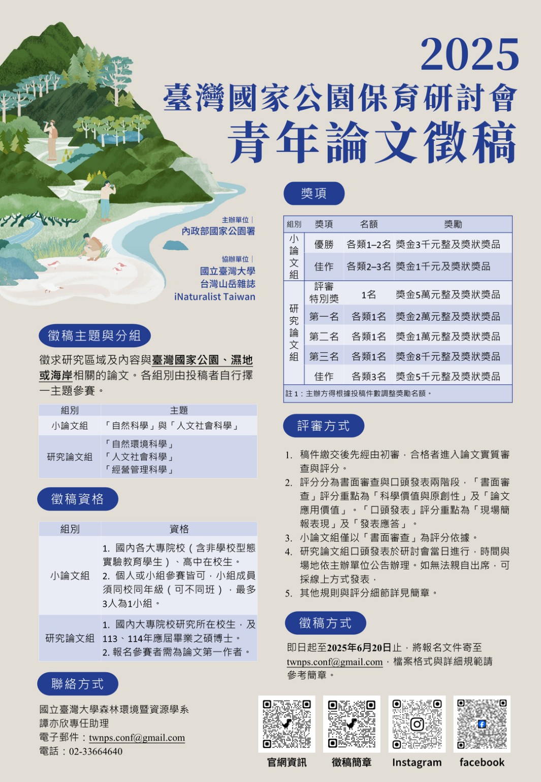 : 內政部國家公園署 辦理「2025年臺灣國家公園保育研討會青年論文徵文競賽」