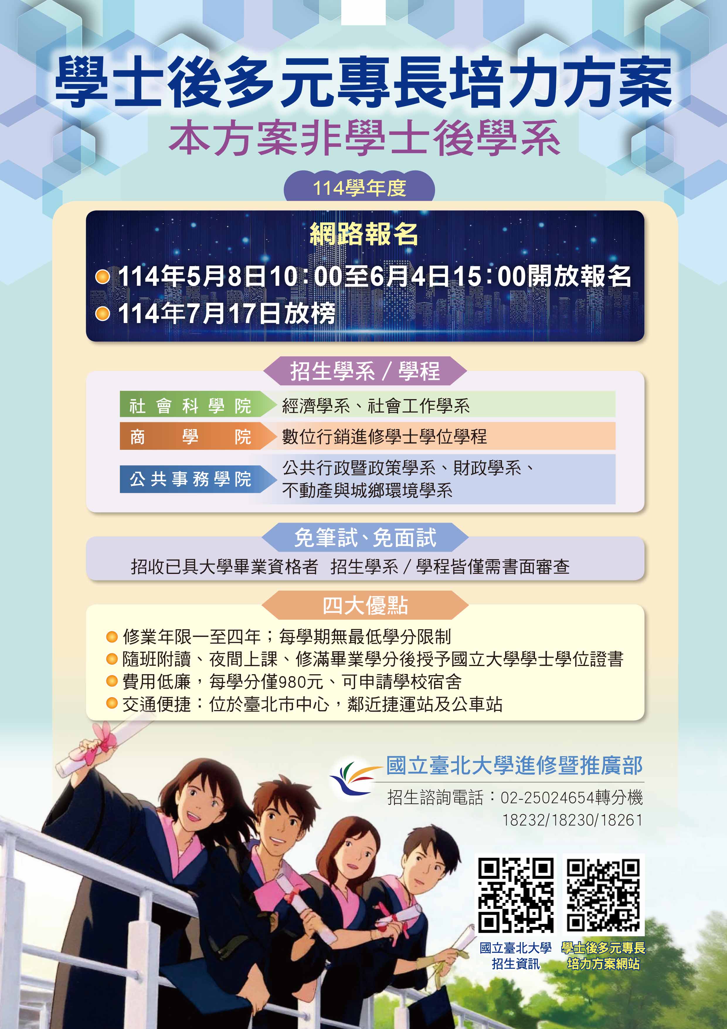 : 國立臺北大學 檢送「114學年度學士後多元專長培力方案招生簡章及文宣海報」