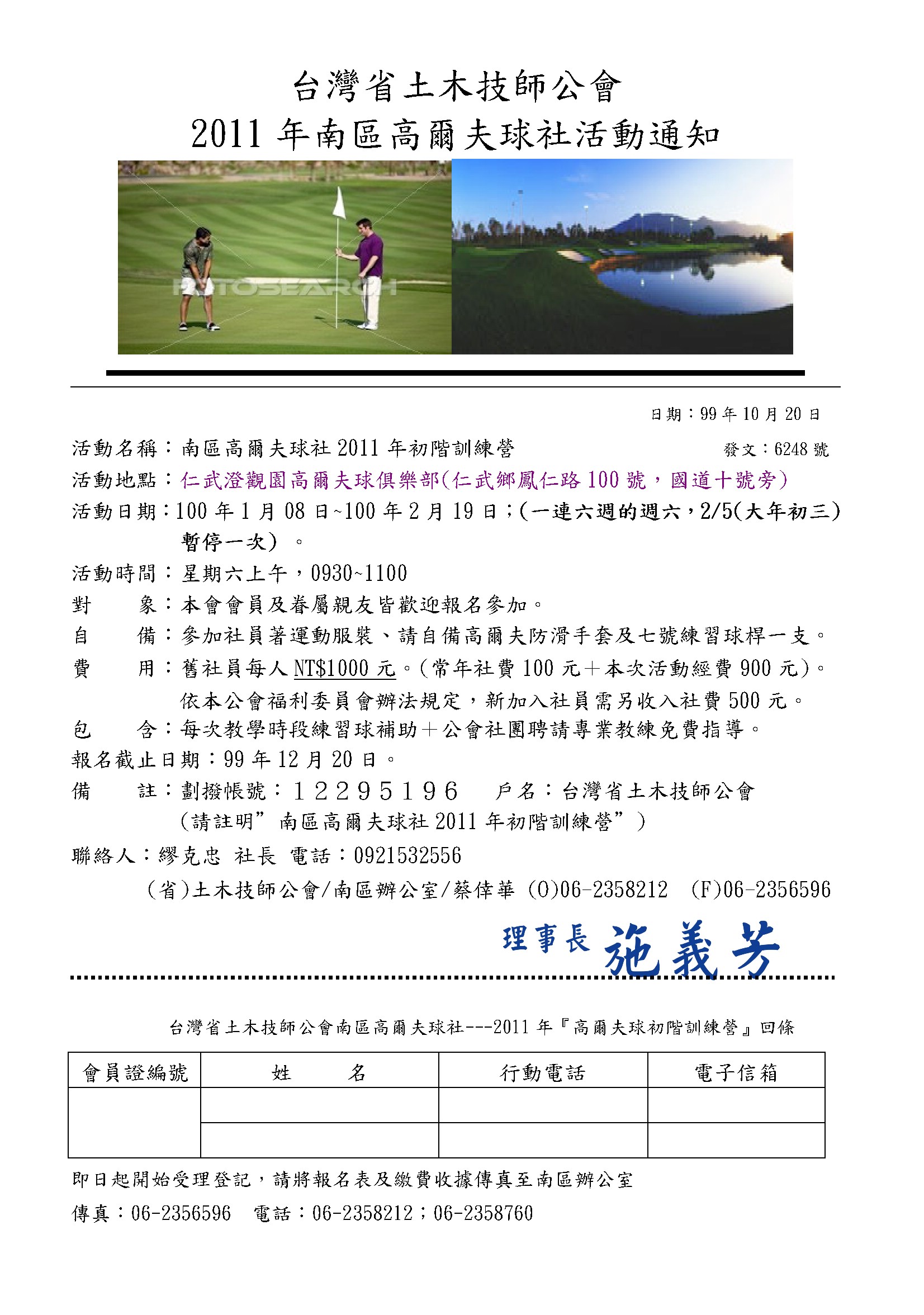 活動名稱:南區高爾夫球社2011年初階訓練 活動地點:仁武澄觀園高爾夫球俱樂部(仁武鄉鳳仁路100號,國道十號旁)活動日期:100年1月08日~100年2月19日;(一連六週的週六,2/5(大年初三)暫停一次) 。