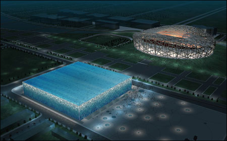 2008年北京奧林匹克運動會,將有兩個最特殊的標誌性場館,那就是國家體育場(鳥巢)及國家游泳中心(水立方)。兩者毗鄰而建在北京市北四、五環路間,新闢建廣達1,135公頃的奧林匹克公園內(其中405公頃為奧運中心區用地)。鳥巢是個橢圓形像雀巢一樣的體育場,中央露天洞開,建築面積為25.8萬平方米,容納91,000個座位,被設計為田徑及足球的比賽場地,亦是舉行開(閉)幕儀式的所在,會後可當作體育比賽及文化娛樂活動的場所,將在2008年8月啟用。而水立方像一塊水藍的冰塊,方方正正,建築面積約8萬平方米,能容17,000個觀眾,作為游泳、跳水及水球的比賽場館,規劃了七個營運分區如商業街等,會後可開放為市民游泳嬉水的地方,將在2008年2月啟用。